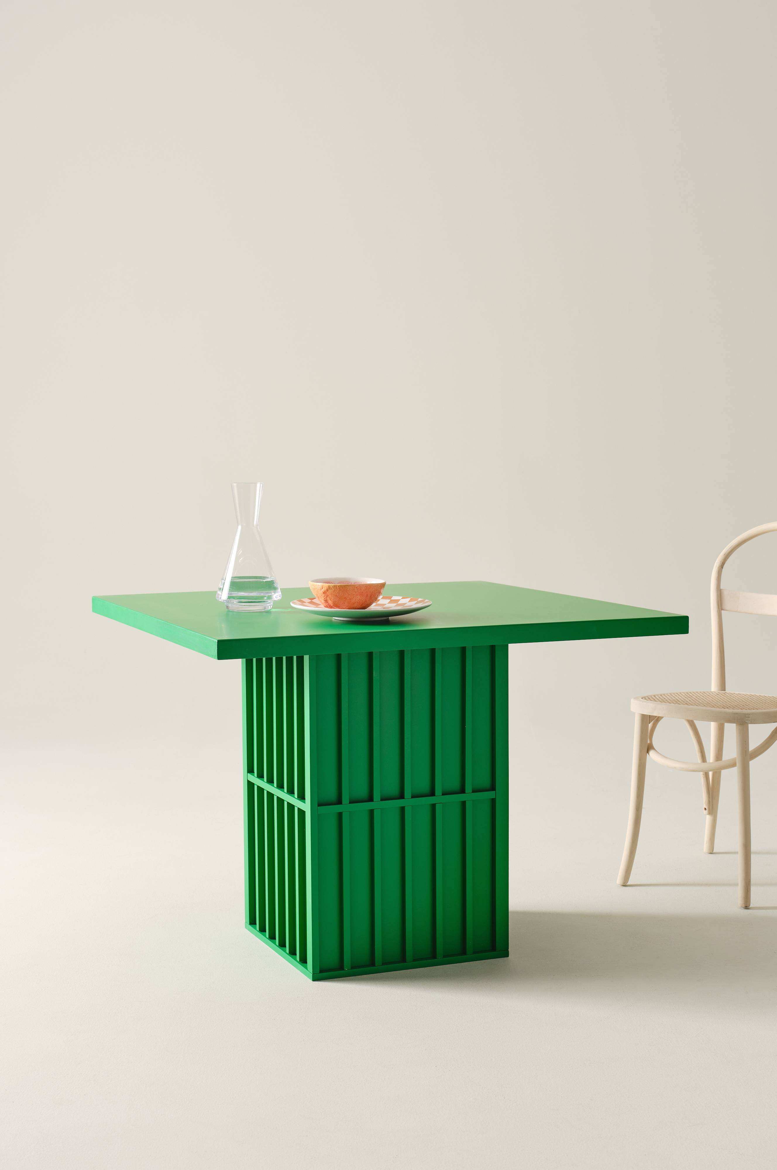 Spisebordet IKSEON er kvadratisk med en søjlefod som har plads til opbevaring. Den ene side af foden har to skjulte låger med push-funktion og soft close-hængsler. Foden har således to rum, et øverst og et forneden, hylden er ikke aftagelig. Skal færdigsamles. Samlevejledning medfølger.