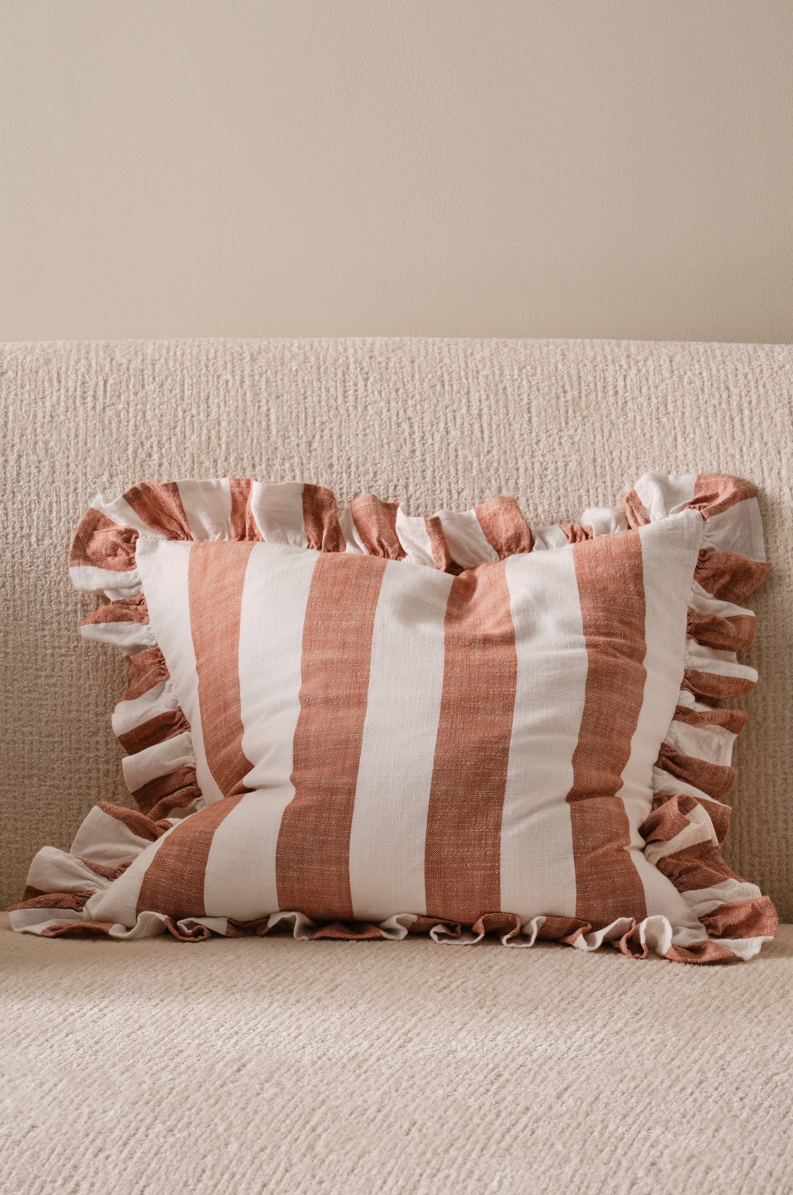 Forvandl dit hjem med pudebetrækket IRIS. Det er fremstillet af bomuldsstof og har et subtilt garnfarvet stribet mønster og en elegant flæsekant. Med sin vintage-inspirerede følelse tilføjer dette pudebetræk en tidløs æstetik, der gør det til en fantastisk accent i enhver stue eller soveværelse. Perfekt til dem, der sætter pris på trendy indretning.