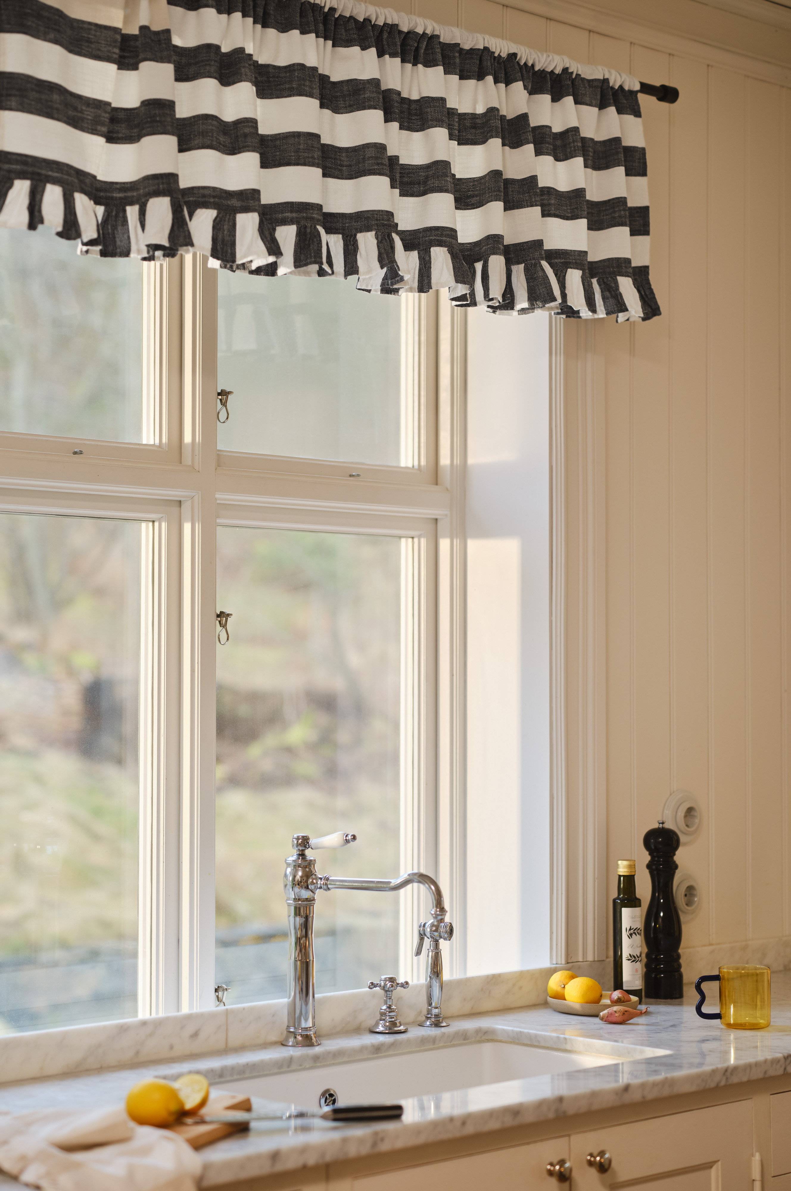 Gardinkappen IRIS giver en tidløs charme til din indretning med sin vintagefornemmelse. Den er fremstillet af bomuldsstof og har et blødt touch, der lover komfort og elegance. Det garnfarvede, stribede mønster giver en subtil visuel interesse, mens volanten i bunden skaber en delikat, iøjnefaldende detalje, der er perfekt til stilfulde opholdsrum.