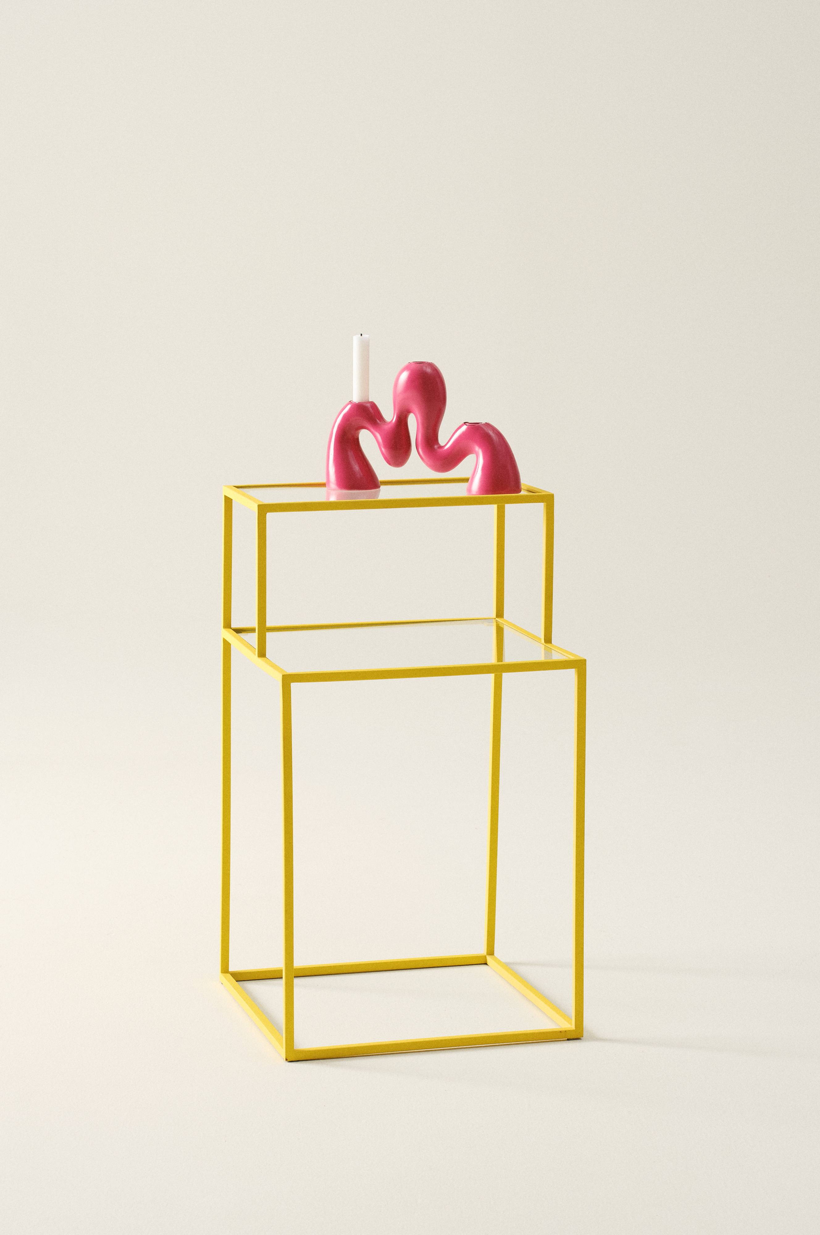 Sidebord i jern med to glasplader placeret i forskellige højder, den ene lidt større end den anden. Stellet er ensfarvet og overfladen er blevet pulverlakeret med en mat finish. Modellen indbyder til mange forskellige anvendelsesmuligheder og de glade farver muntrer dig op. Vil du have et mere nedtonet look, er det sorte bord en god mulighed.