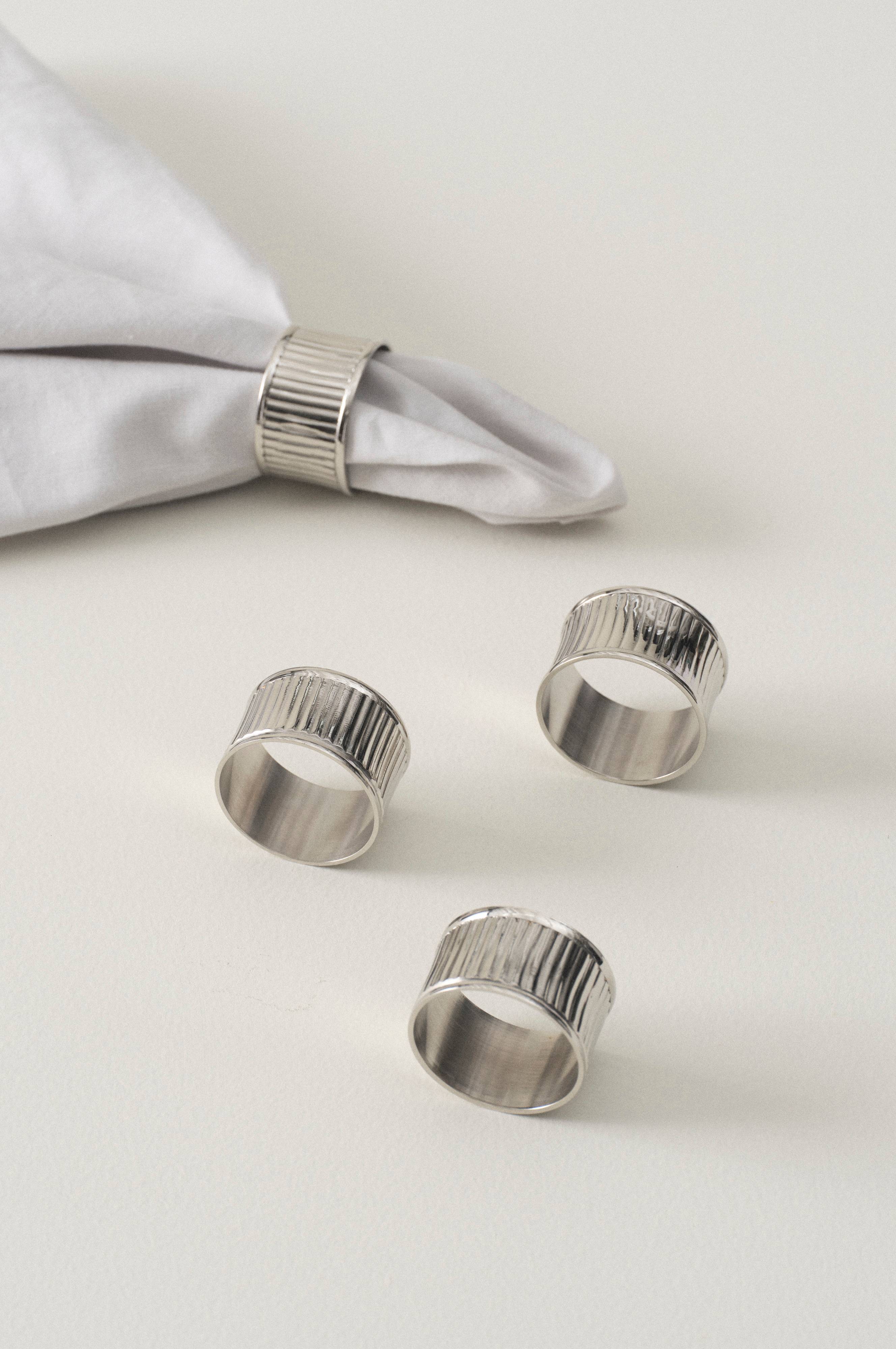 4-pak med servietringe af messing med stribet reliefmønster og nikkelplettering.