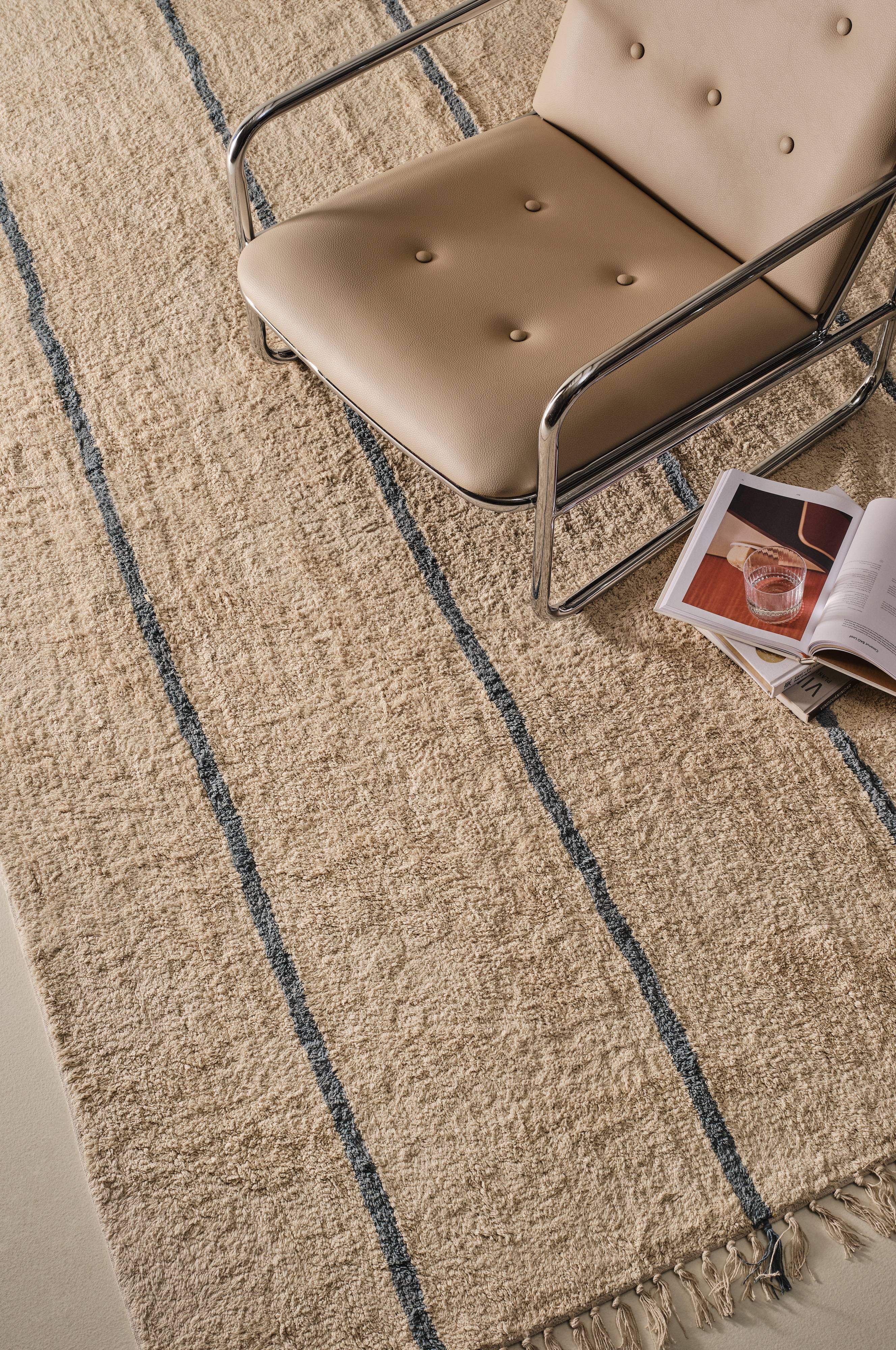 Tuftet tæppe af bomuld med blød luv. Tæppet har garnfarvede striber som giver et frisk og klassisk udtryk og gør det nemt at placere tæppet i forskellige rum. Længde på frynser 10 cm. Luvhøjde 1 cm. Tykkelse 1,1 cm. 1400 g/m².