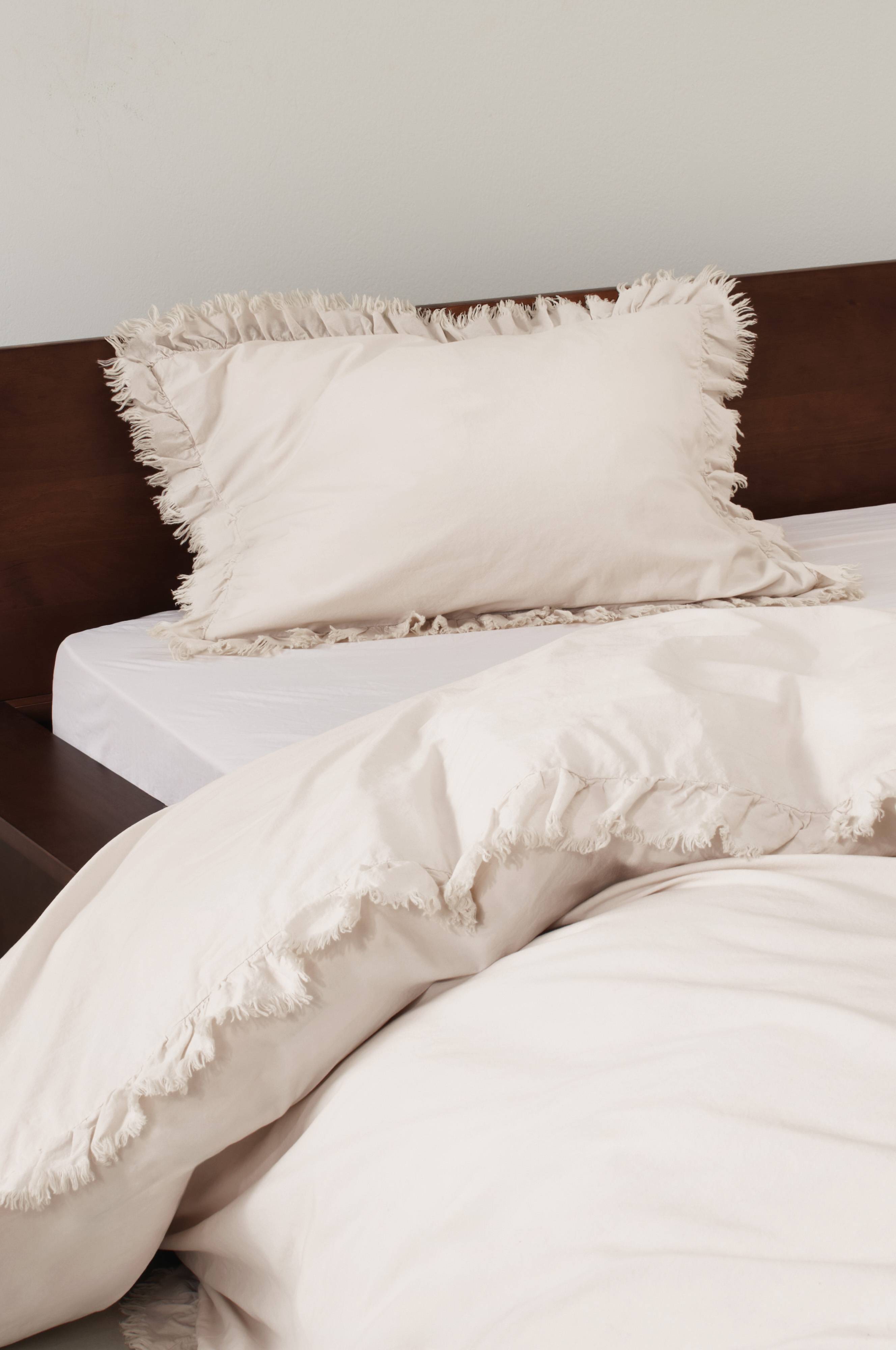 Pudebetræk af vasket bomuld med blødt udtryk. Bomuld er behageligt at sove i, opleves svalt og skønt mod huden. JINN har en let frynset flæsekant rundt om. Trådtæthed på 144 tc. (Trådtætheden angiver antal tråde, Thread Count, pr. kvadrattomme i et stof. Jo højere trådtæthed desto højere kvalitet.)