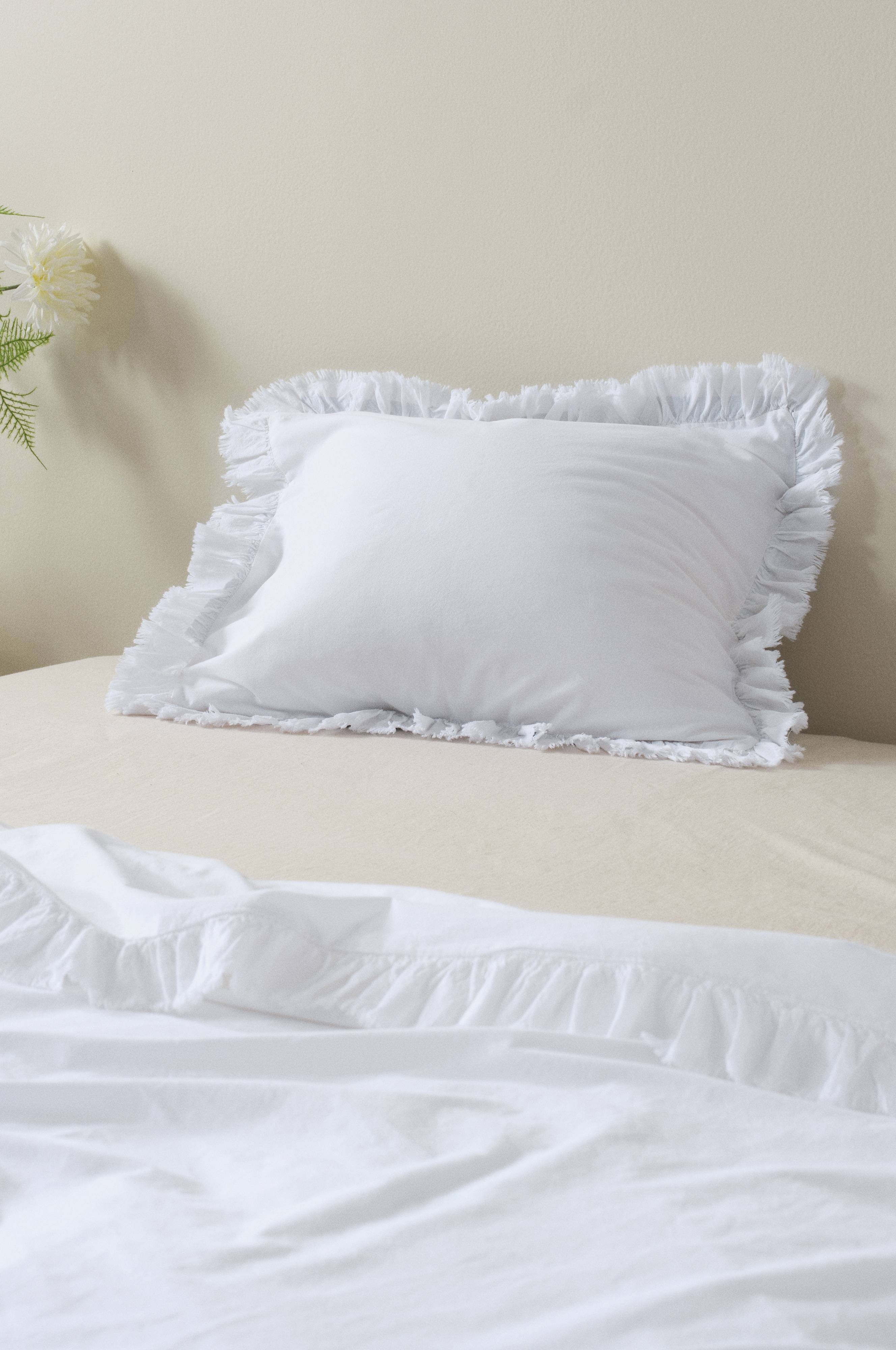 Pudebetræk af vasket bomuld med blødt udtryk. Bomuld er behageligt at sove i, opleves svalt og skønt mod huden. JINN har en let frynset flæsekant rundt om. Trådtæthed 144 TC. (Trådtætheden angiver antal tråde, Thread Count, pr. kvadrattomme i et stof. Jo højere trådtæthed desto højere kvalitet.)