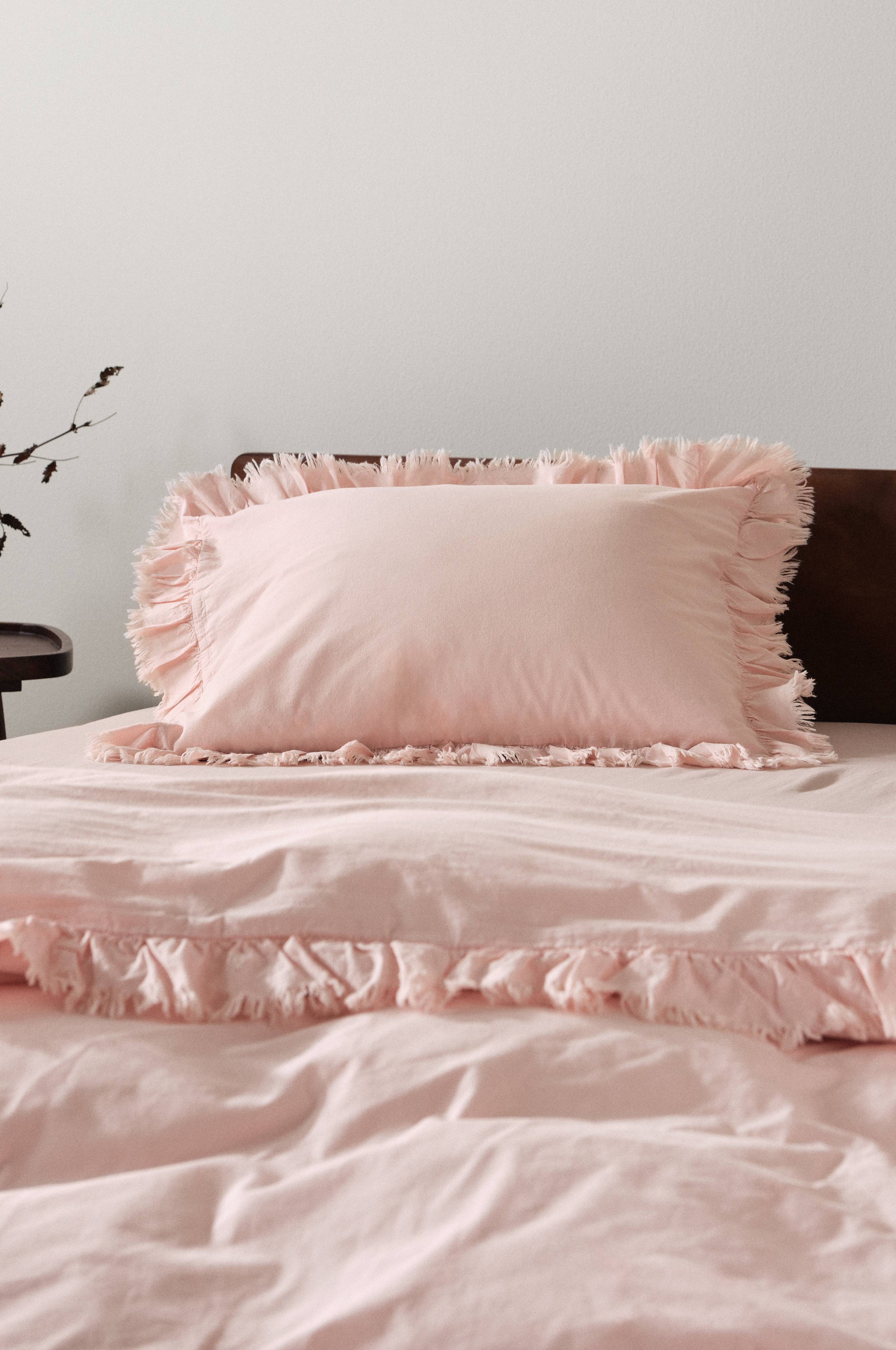 Pudebetræk af vasket bomuld med blødt udtryk. Bomuld er behageligt at sove i, opleves svalt og skønt mod huden. JINN har en let frynset flæsekant rundt om. Trådtæthed 144 TC. (Trådtætheden angiver antal tråde, Thread Count, pr. kvadrattomme i et stof. Jo højere trådtæthed desto højere kvalitet.)