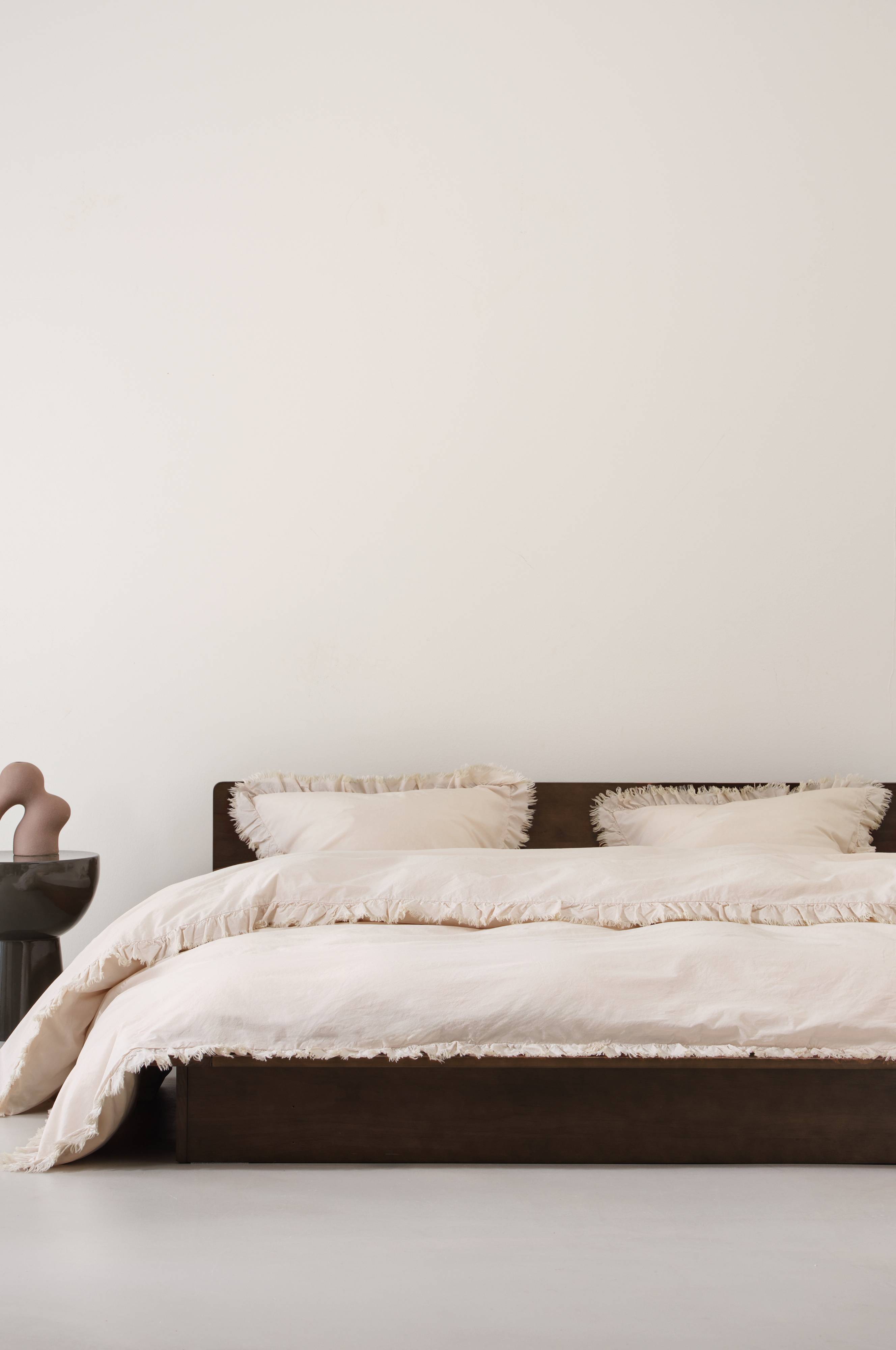 Sengesæt i tre dele, et ekstra bredt dynebetræk og to pudebetræk af vasket bomuld med blødt udtryk. Bomuld er behageligt at sove i, opleves svalt og skønt mod huden. JINN har en let frynset flæsekant rundt om. Trykknapper til lukning på dynebetrækket. Trådtæthed 144 TC. (Trådtætheden angiver antal tråde, Thread Count, pr. kvadrattomme i et stof. Jo højere trådtæthed desto højere kvalitet.)
