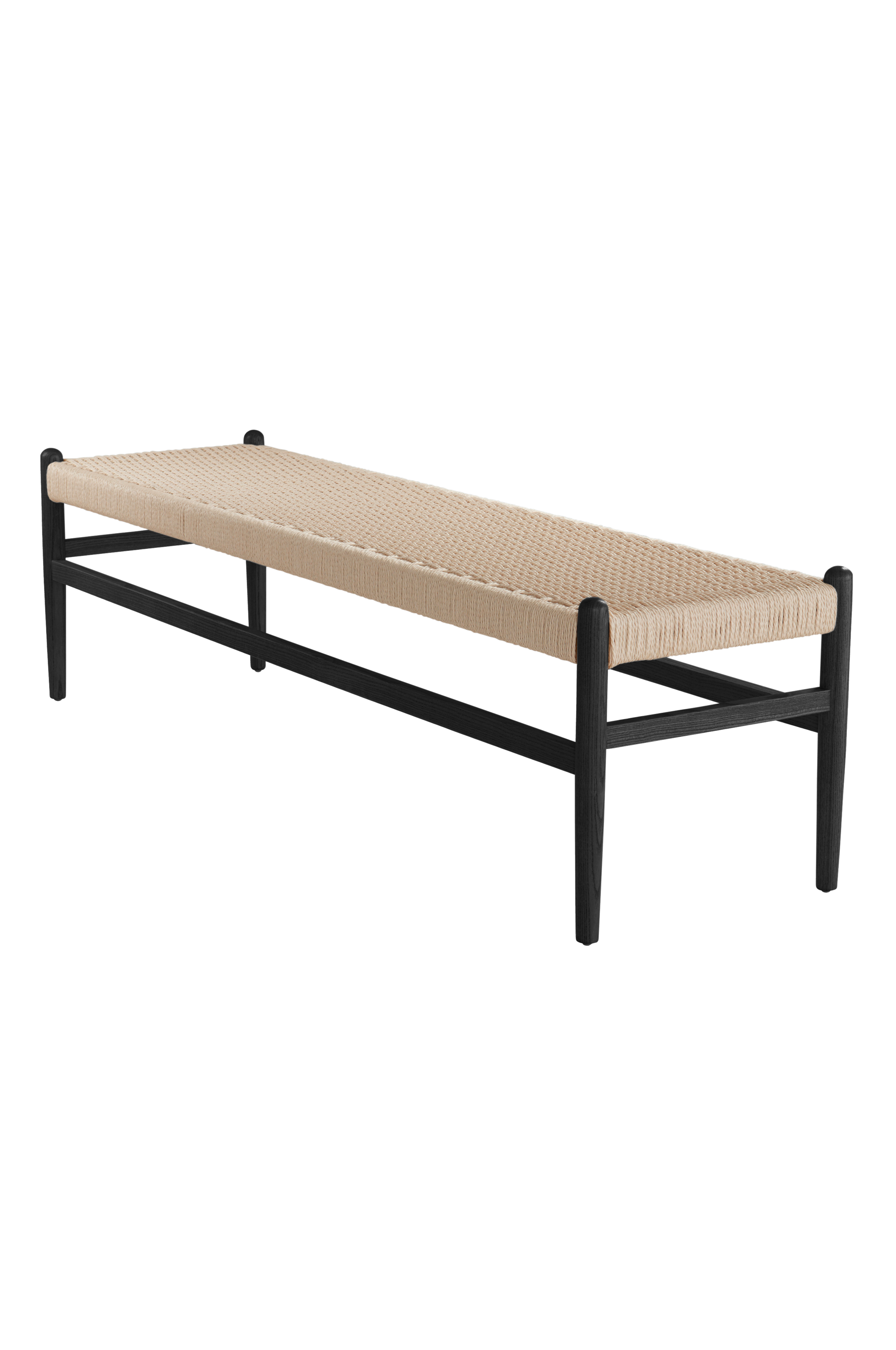 Bænk i massiv birk med sæder af flettede papirsnore. Kontrasten mellem papir og træ bliver effektfuld og sædet giver god siddekomfort.
