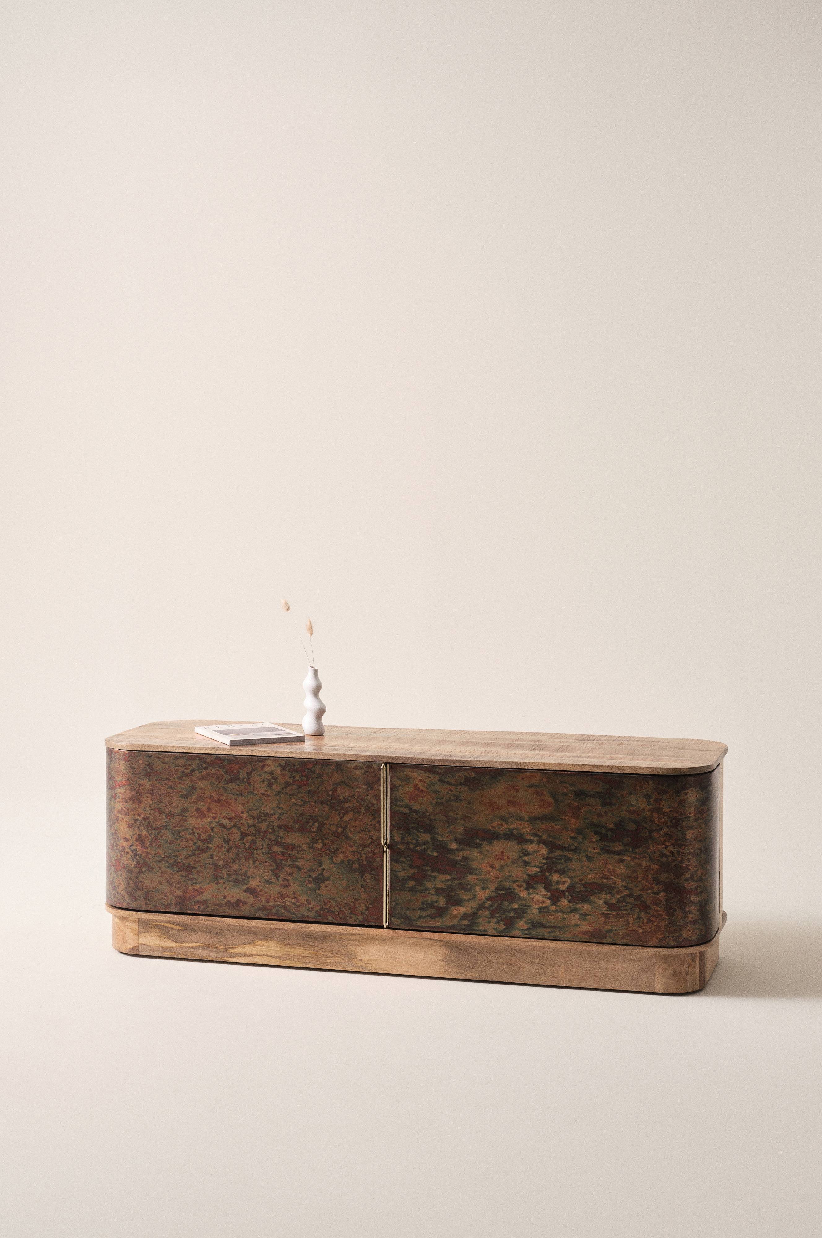 Tv-bænk af massiv mango med naturlige årer og låger af lækker oxideret stål. Den oxiderede overflade har unikt mønster, der ligner olie i vand, og de to låger har effektfulde messinggreb. Det, kombineret med fint mangotræ, gør JORO til et møbel der skiller sig ud fra mængden. Lågerne er lette og de holdes lukkede med magnetlås. Bag lågerne gemmer sig en fast hylde på midten, hylden er inddelt i to større rum midt foran og to små afrundede hylder i hver ende. Her opbevarer du perfekte medieenheder, men også andre ting, du vil have lige ved hånden. JORO er et praktisk møbel som indtager rummet og giver det karakter.
