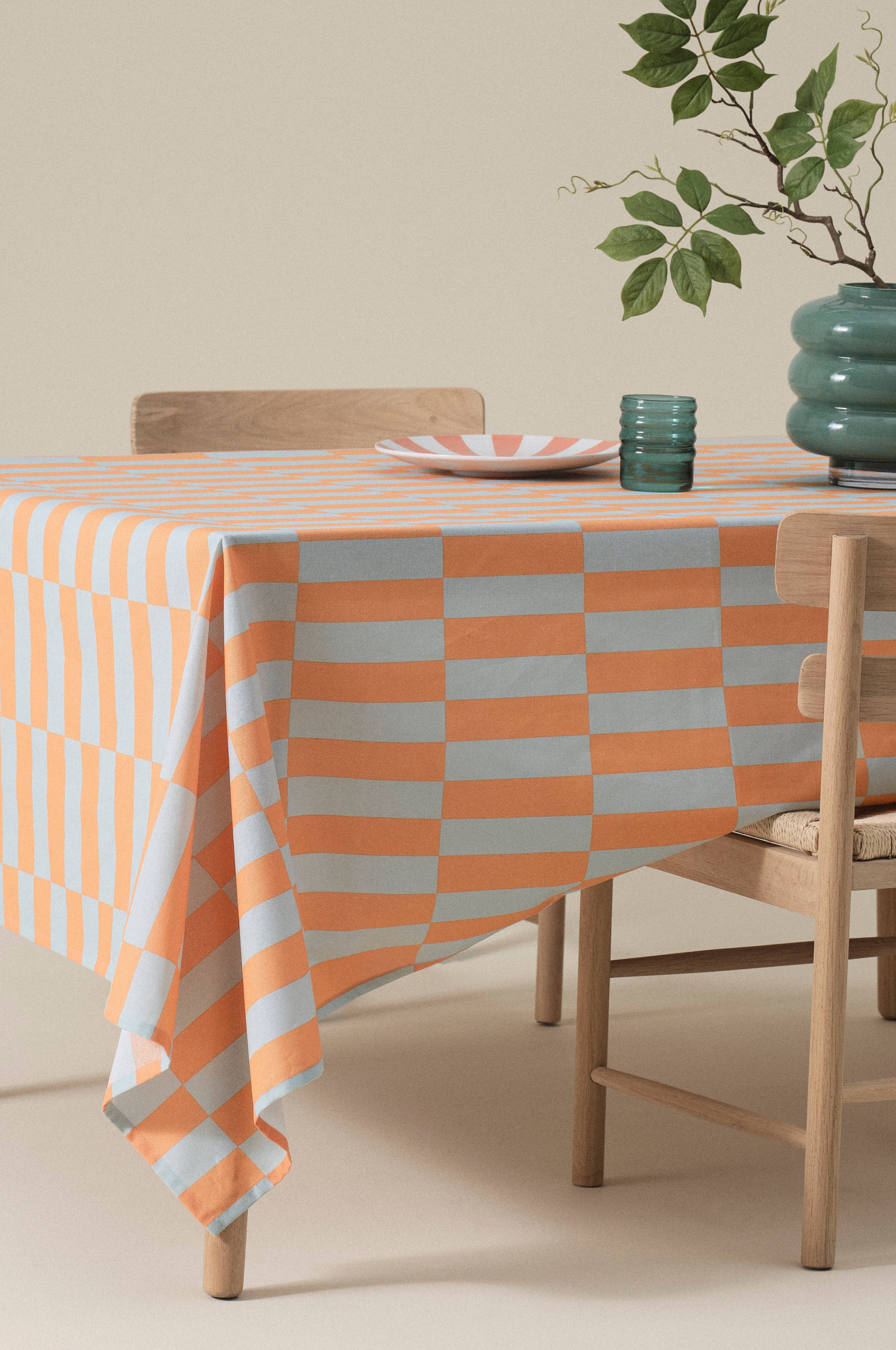 Dug med printet stribet mønster, der danner firkanter i kontrastfarver. Stoffet har en vandafvisende akrylatbehandling, der gør det let at tørre dugen af. Perfekt til hygge med saft i haven. Stoffets gramvægt er 170 g/m².