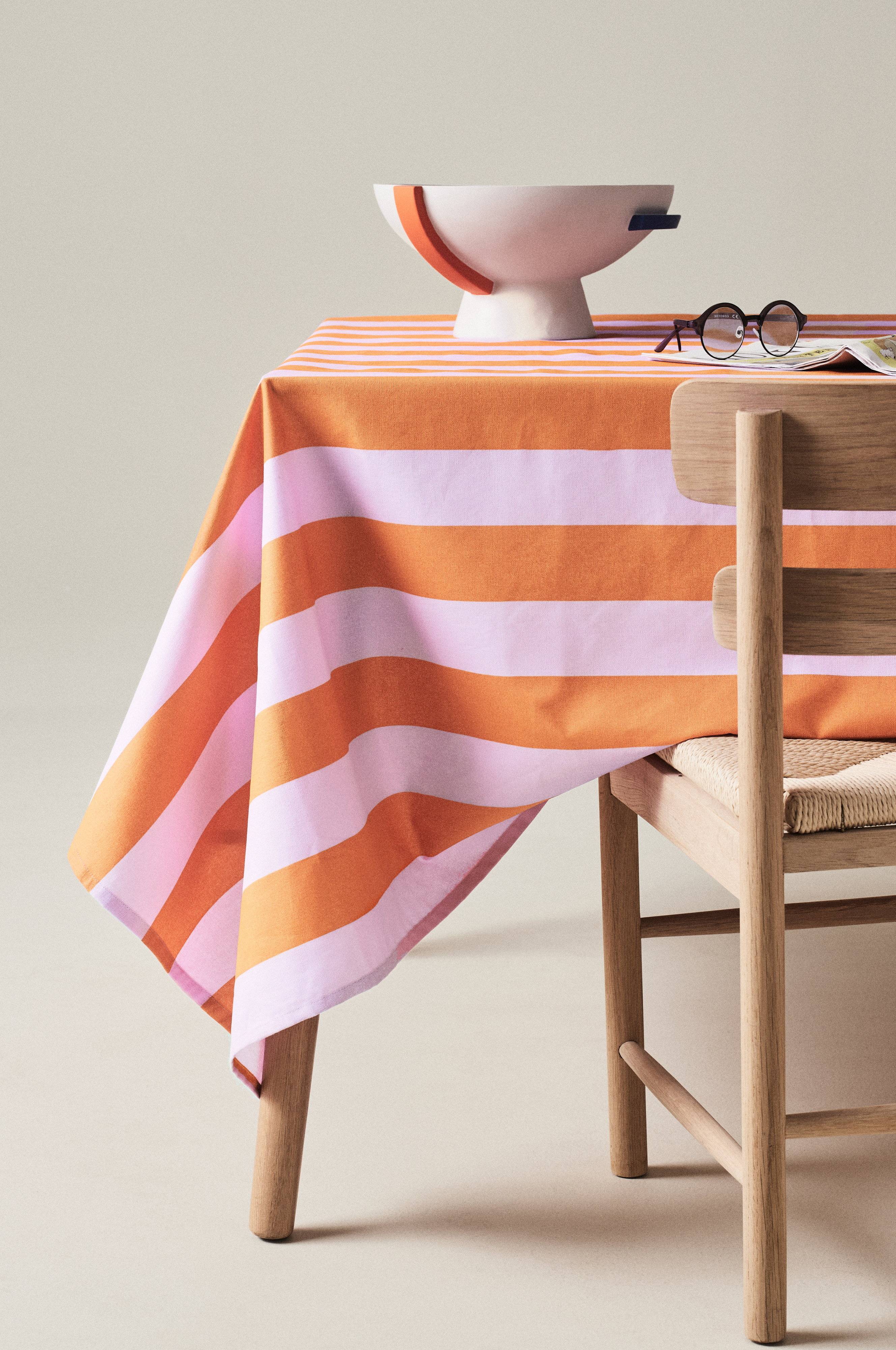 Dug med blokstribet mønster i kontrastfarver printet på vævet bomuldsstof med akrylatbelagt bagside. Stoffets yderside er behageligt mat og føles som almindeligt stof. Akrylatbehandlingen gør dugen praktisk, slidstærk og vandafvisende. Denne type dug er meget praktisk udendørs og til børnefamilier som vil beskytte køkkenbordet og samtidigt dække pænt op.