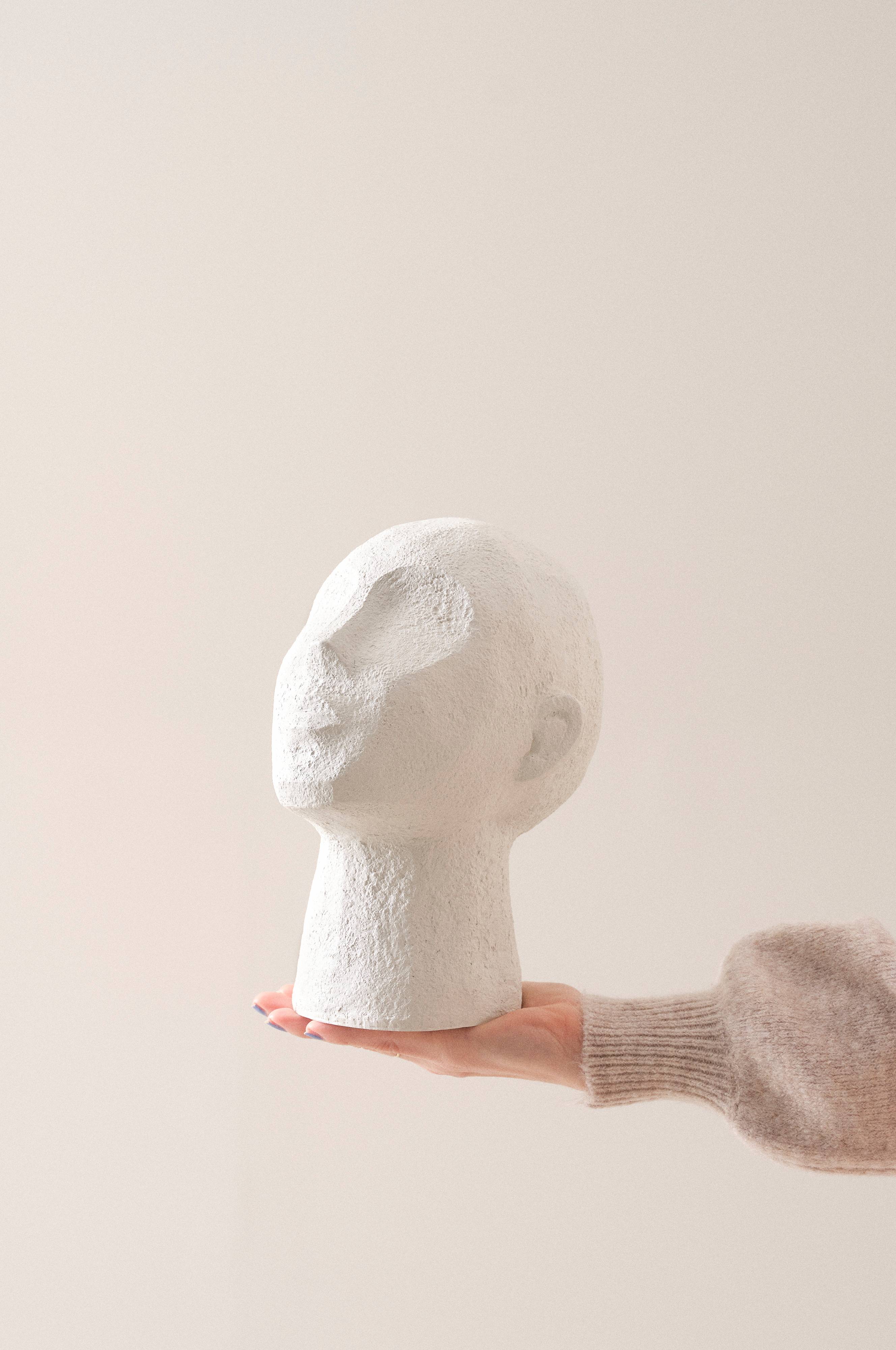 Dekoration af polyresin med mat overflade. Det blødt formede ansigt har diskrete træk og bløde linjer. JUSTUS skaber en smuk silhuet i den rette belysning.