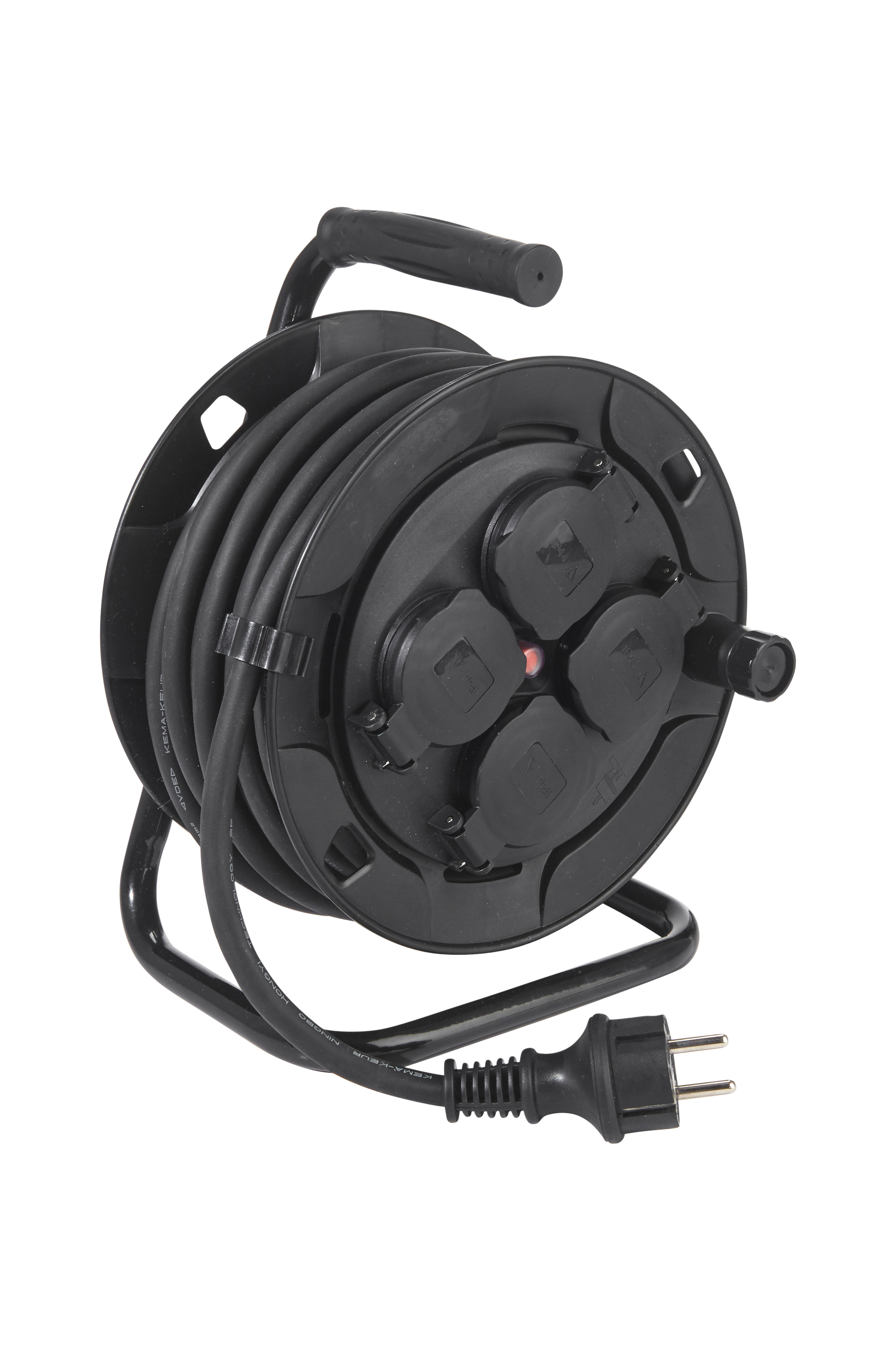 Kabelrulle til udendørs brug med 4 stik på rullende cylinder. Sort, kraftigt gummikabel. Jordet, sikring.