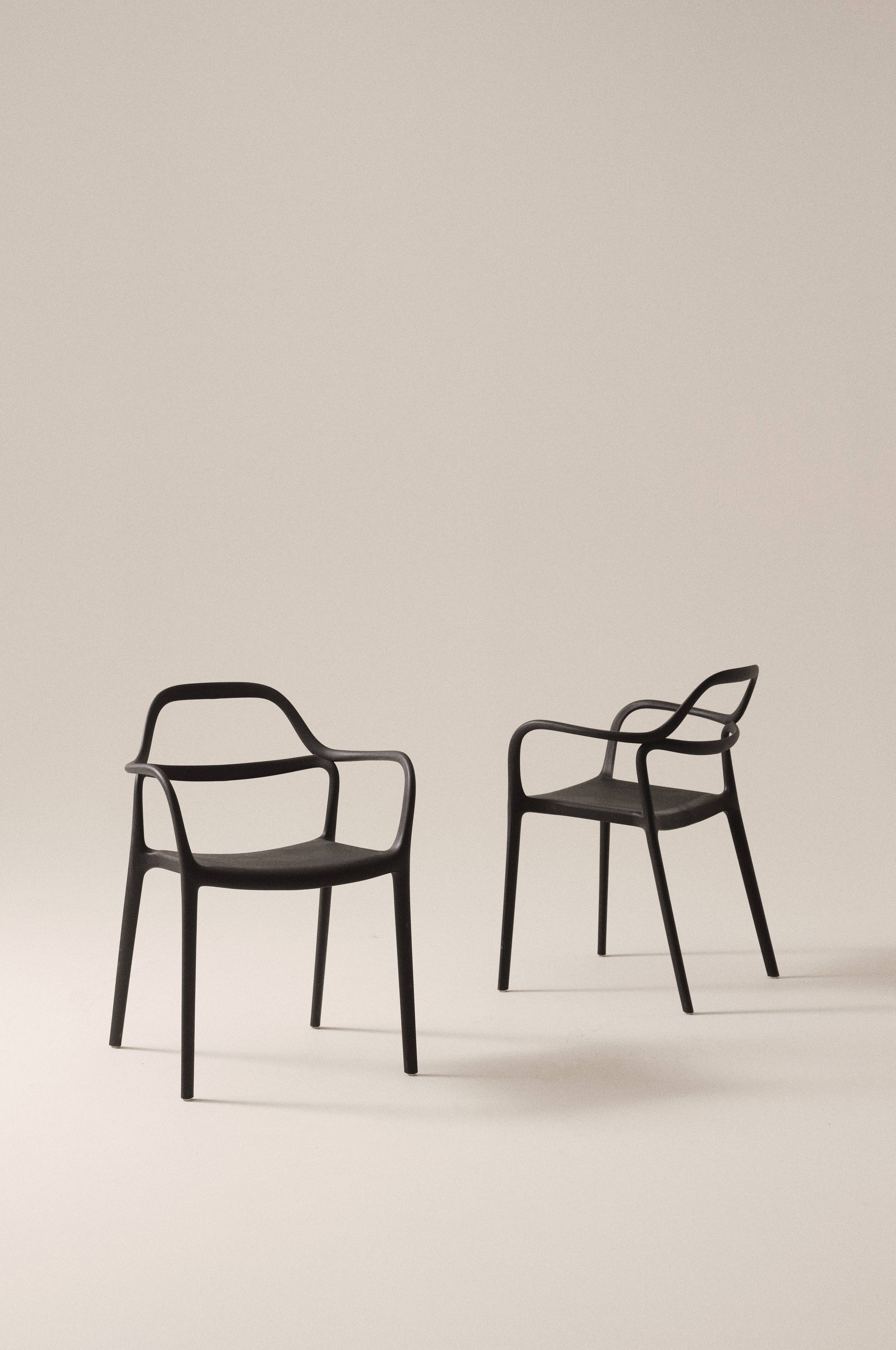 En glat og stilfuld stol, der kan stables. Let at tørre, da vi vil bruge dem udendørs på balkonen