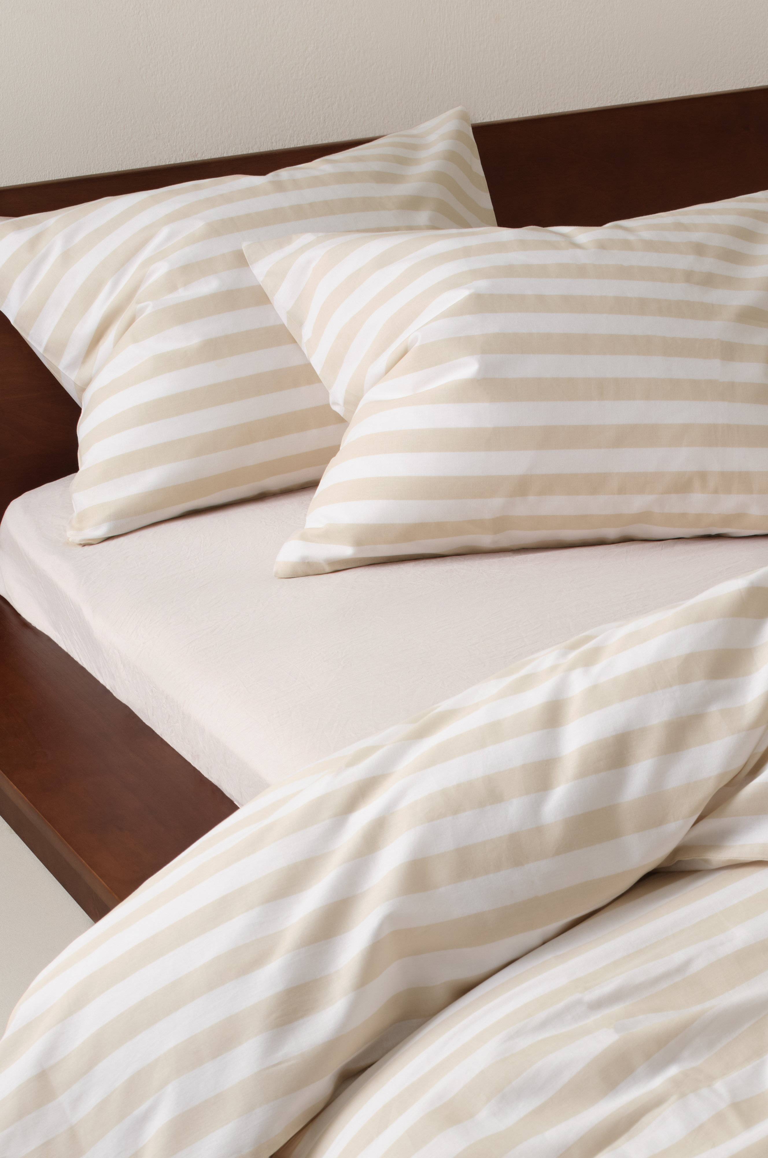 2-pak pudebetræk af stribet bomuld. Den tværgående stribe er printet i friske, sommerlige farver og på begge sider af pudebetrækkene. Bomuld er en blød og behagelig kvalitet som føles kølig mod huden. Trådtæthed 144 TC. (Trådtætheden angiver antal tråde, thread count, pr. kvadrattomme i et stof. Jo højere trådtæthed desto højere kvalitet. Dog undtaget hør, der ofte væves løsere for at få det rette udtryk).