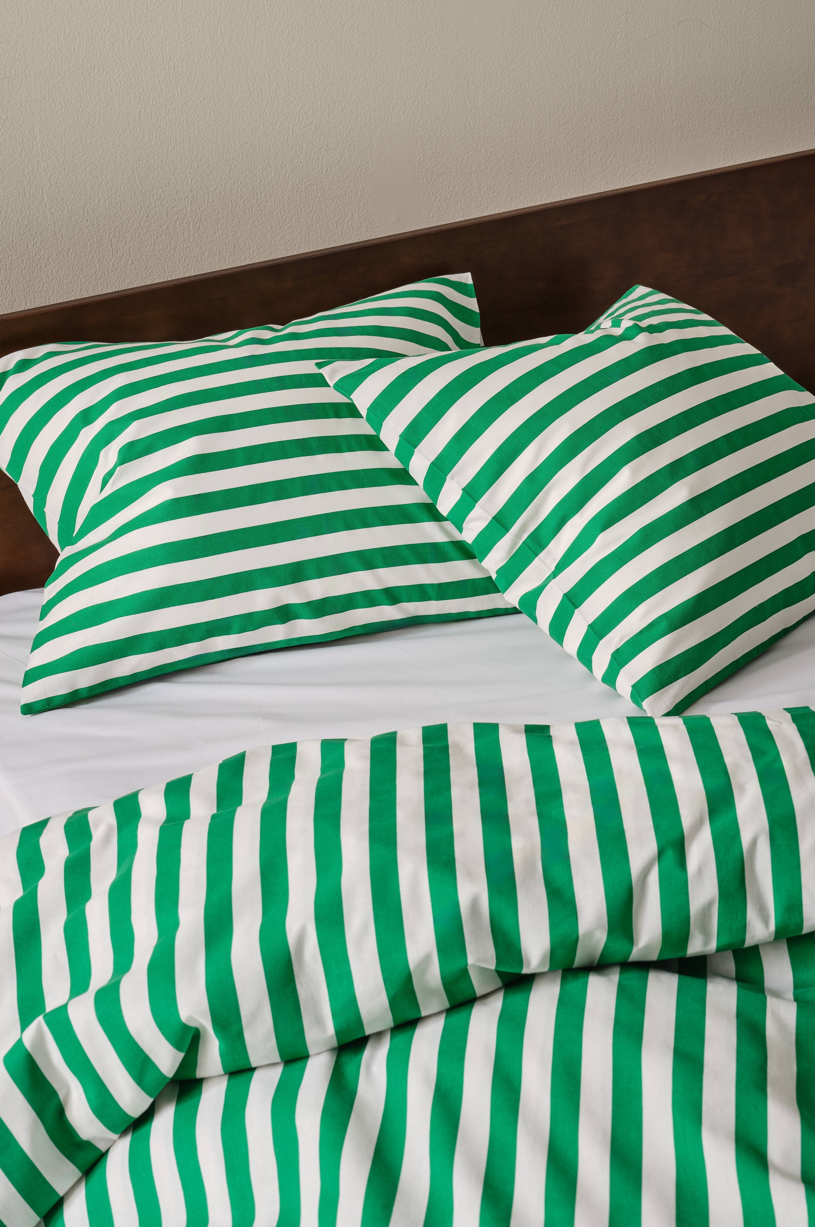 2-pak pudebetræk af stribet bomuld. Den tværgående stribe er printet i friske, sommerlige farver og på begge sider af pudebetrækkene. Bomuld er en blød og behagelig kvalitet som føles kølig mod huden. Trådtæthed 144 TC. (Trådtætheden angiver antal tråde, thread count, pr. kvadrattomme i et stof. Jo højere trådtæthed desto højere kvalitet. Dog undtaget hør, der ofte væves løsere for at få det rette udtryk).