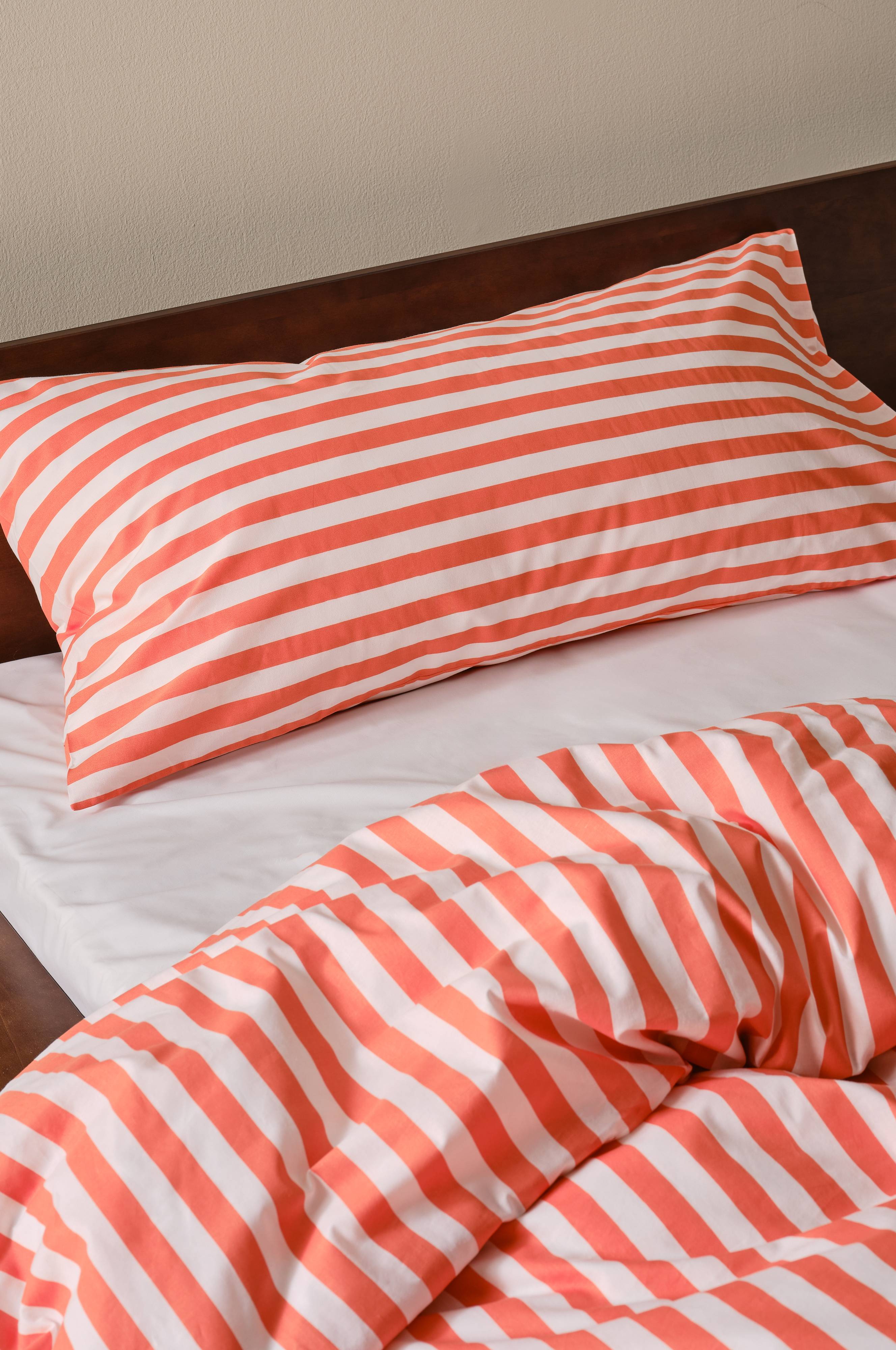1-pak pudebetræk af stribet bomuld. Den tværgående stribe er printet i friske, sommerlige farver og på begge sider af pudebetrækket. Bomuld er en blød og behagelig kvalitet som føles kølig mod huden. Trådtæthed 144 TC. (Trådtætheden angiver antal tråde, thread count, pr. kvadrattomme i et stof. Jo højere trådtæthed desto højere kvalitet. Dog undtaget hør, der ofte væves løsere for at få det rette udtryk).