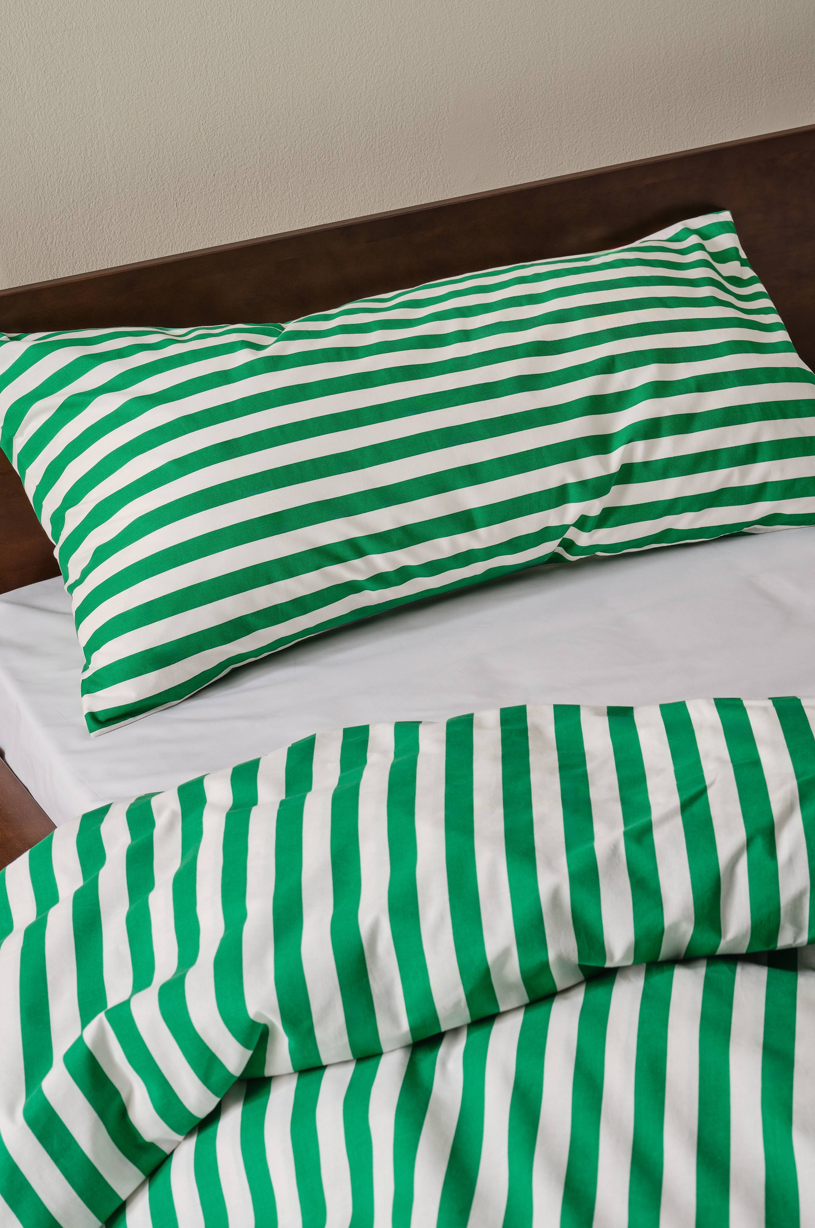 1-pak pudebetræk af stribet bomuld. Den tværgående stribe er printet i friske, sommerlige farver og på begge sider af pudebetrækket. Bomuld er en blød og behagelig kvalitet som føles kølig mod huden. Trådtæthed 144 TC. (Trådtætheden angiver antal tråde, thread count, pr. kvadrattomme i et stof. Jo højere trådtæthed desto højere kvalitet. Dog undtaget hør, der ofte væves løsere for at få det rette udtryk).