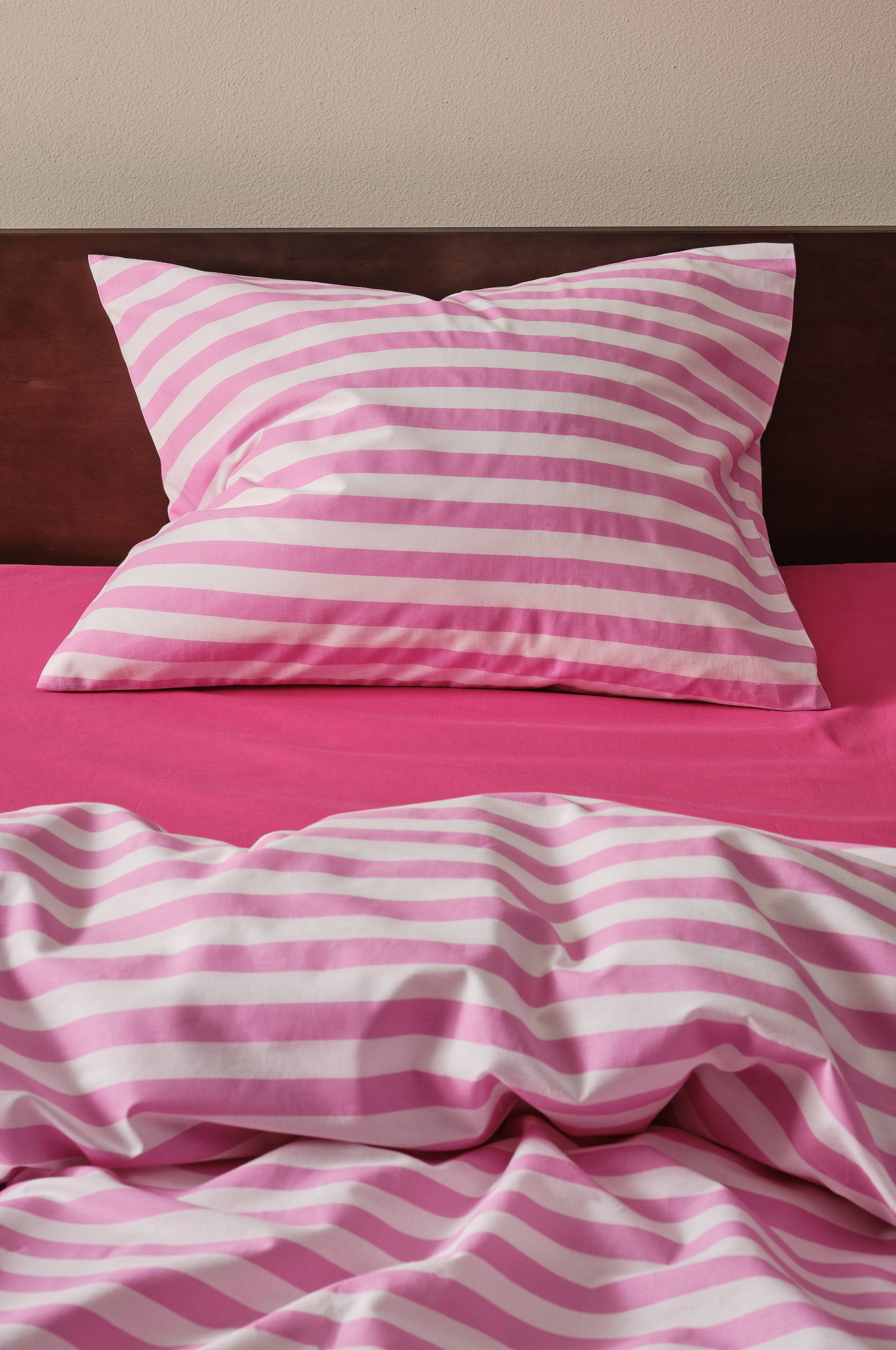 1-pak pudebetræk af stribet bomuld. Den tværgående stribe er printet i friske, sommerlige farver og på begge sider af pudebetrækket. Bomuld er en blød og behagelig kvalitet som føles kølig mod huden. Trådtæthed 144 TC. (Trådtætheden angiver antal tråde, thread count, pr. kvadrattomme i et stof. Jo højere trådtæthed desto højere kvalitet. Dog undtaget hør, der ofte væves løsere for at få det rette udtryk).
