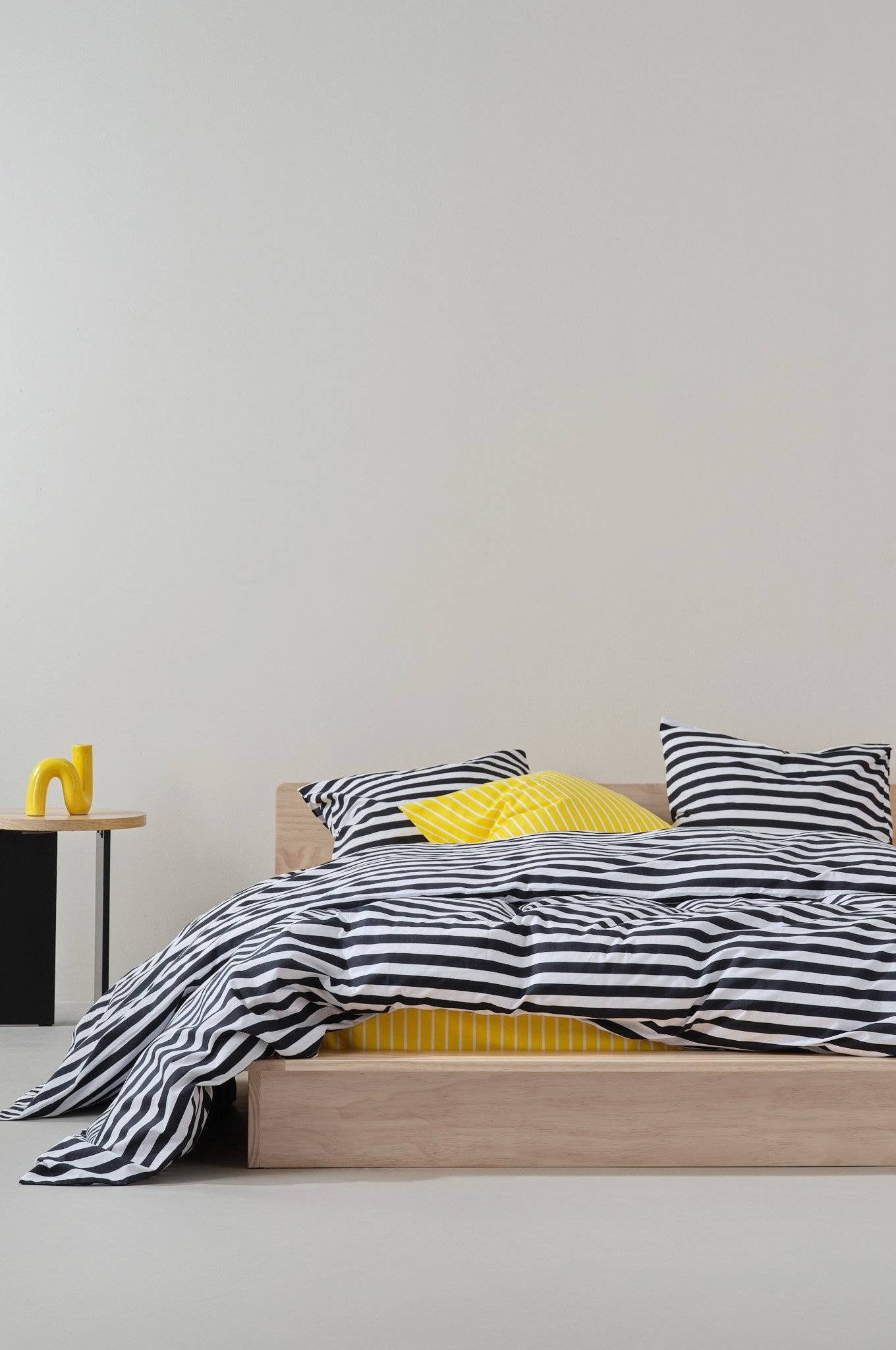Stribet dynebetræk i tre dele, et ekstra bredt dynebetræk og to pudebetræk i bomuld. Den tværgående stribe er trykt i friske, sommerlige farver på begge sider af pudebetræk og dynebetræk. Bomuld er en blød og behagelig kvalitet, som føles kølig mod huden.