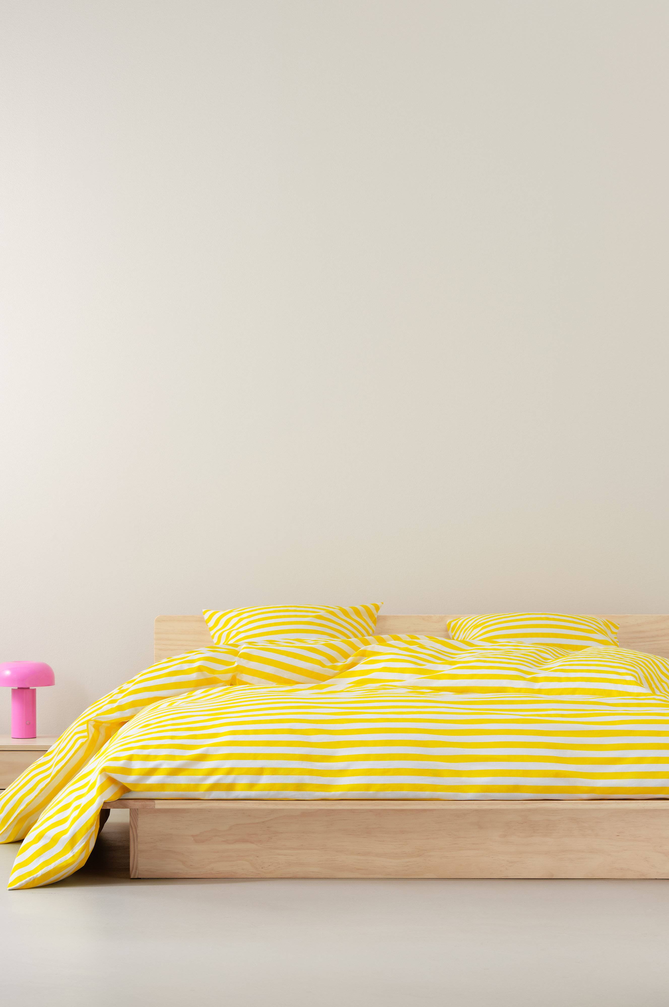 Stribet dynebetræk i tre dele, et ekstra bredt dynebetræk og to pudebetræk i bomuld. Den tværgående stribe er trykt i friske, sommerlige farver på begge sider af pudebetræk og dynebetræk. Bomuld er en blød og behagelig kvalitet, som føles kølig mod huden.