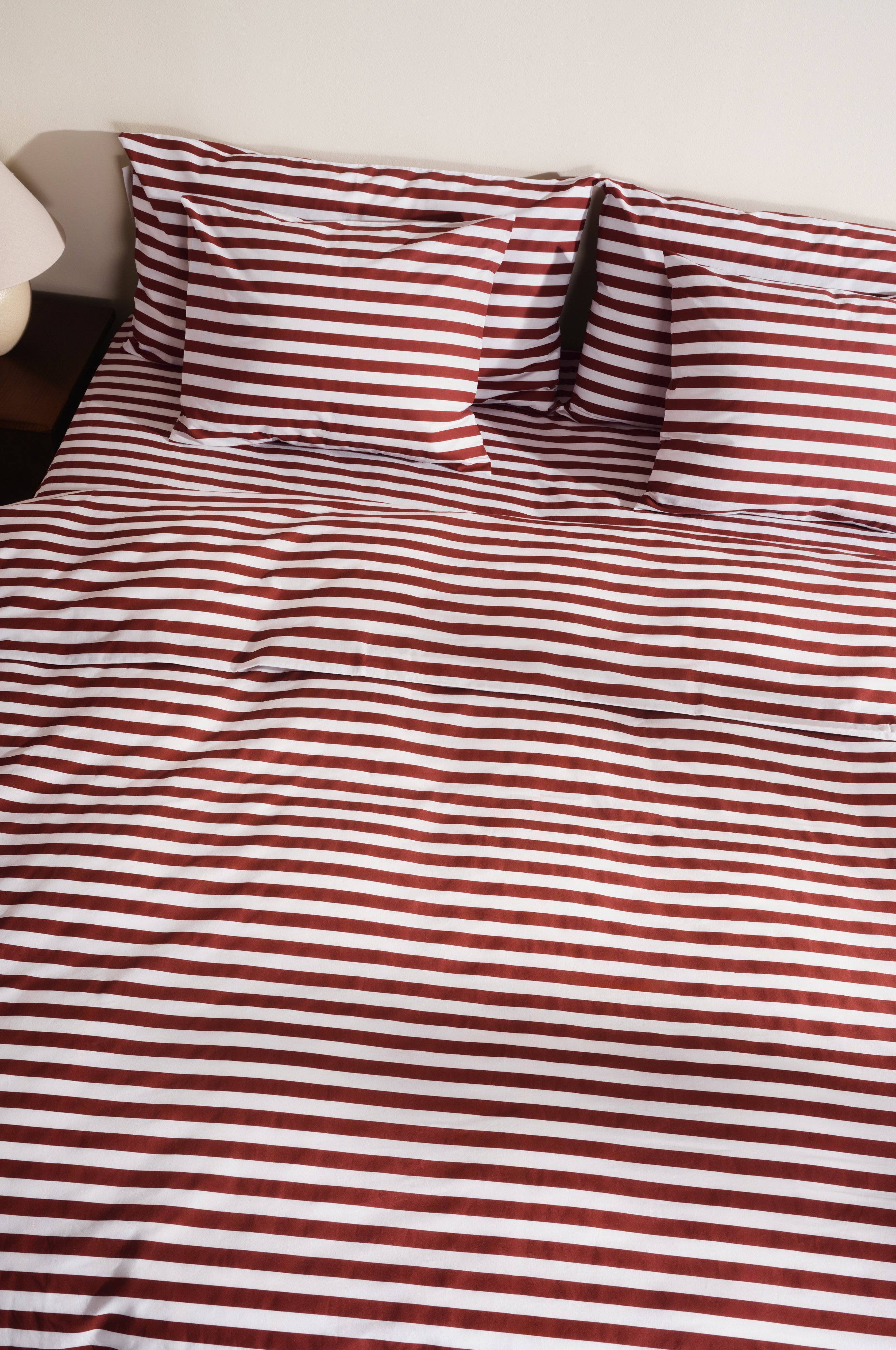 Stribet dynebetræk i tre dele, et ekstra bredt dynebetræk og to pudebetræk i bomuld. Den tværgående stribe er trykt i friske, sommerlige farver på begge sider af pudebetræk og dynebetræk. Bomuld er en blød og behagelig kvalitet, som føles kølig mod huden.