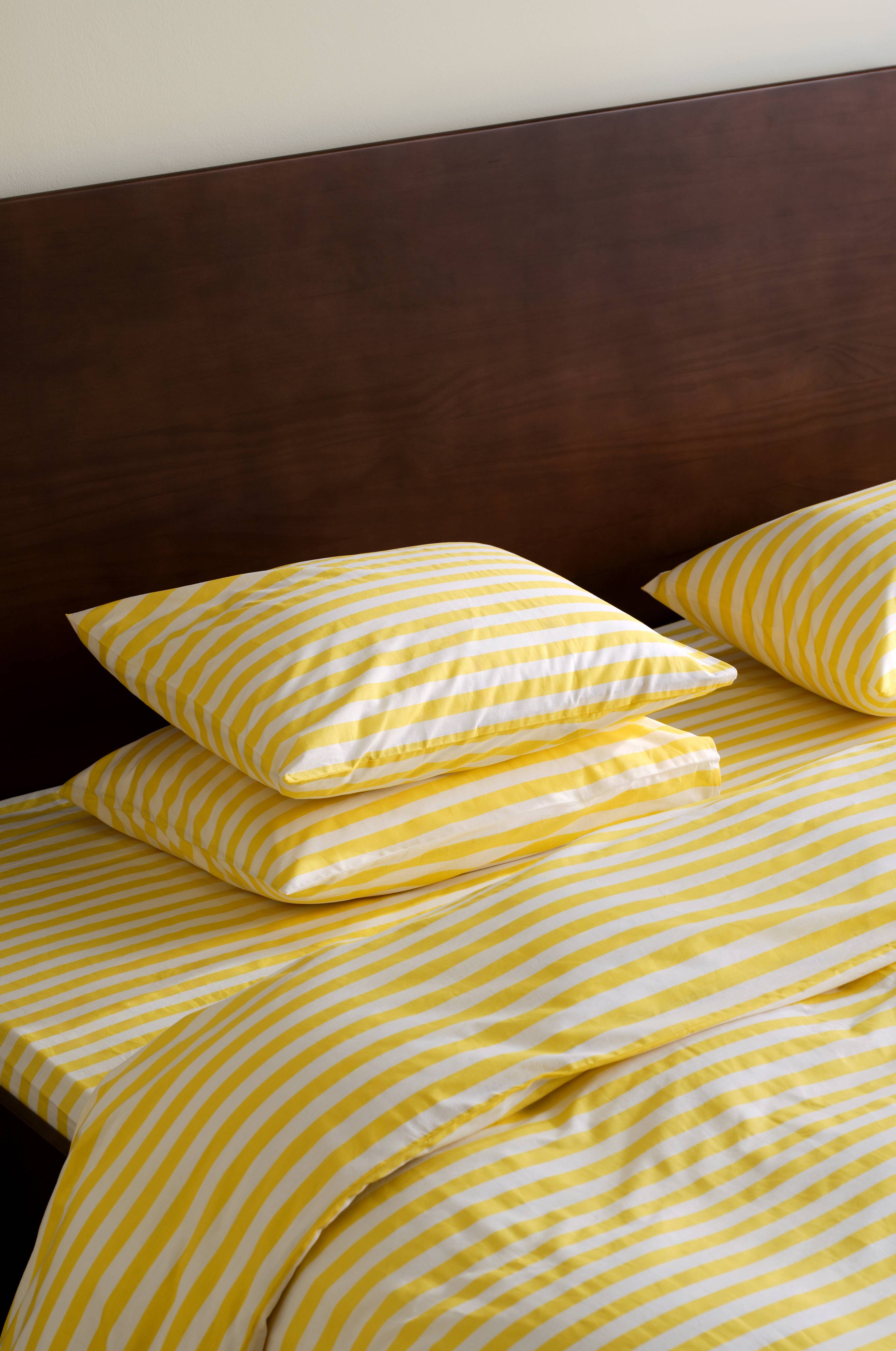 Stribet dynebetræk i tre dele, et ekstra bredt dynebetræk og to pudebetræk i bomuld. Den tværgående stribe er trykt i friske, sommerlige farver på begge sider af pudebetræk og dynebetræk. Bomuld er en blød og behagelig kvalitet, som føles kølig mod huden.