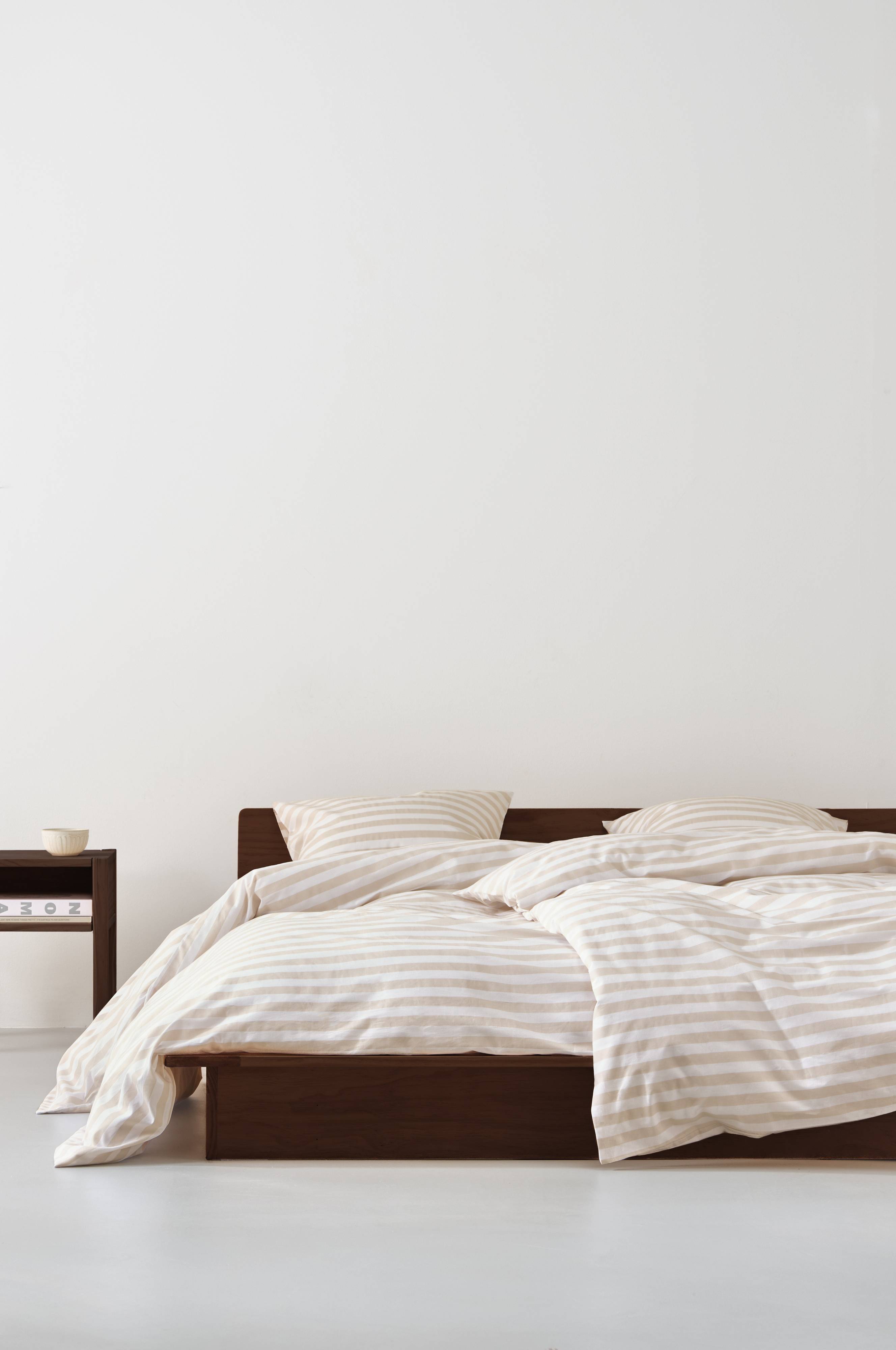 Stribet sengesæt i to dele, et dynebetræk og et pudebetræk af bomuld. Den tværgående stribe er printet i friske, sommerlige farver og på begge sider af pudebetræk og dynebetræk. Bomuld er en blød og behagelig kvalitet som føles kølig mod huden. Åbning i de øverste hjørner på dynebetrækket, så det er nemt at trække dynebetrækket over dynen. Trådtæthed på 144 tc. (Trådtætheden angiver antal tråde, thread count, pr. kvadrattomme i et stof. Jo højere trådtæthed desto højere kvalitet. Dog undtaget hør, der ofte væves løsere for at få det rette udtryk).