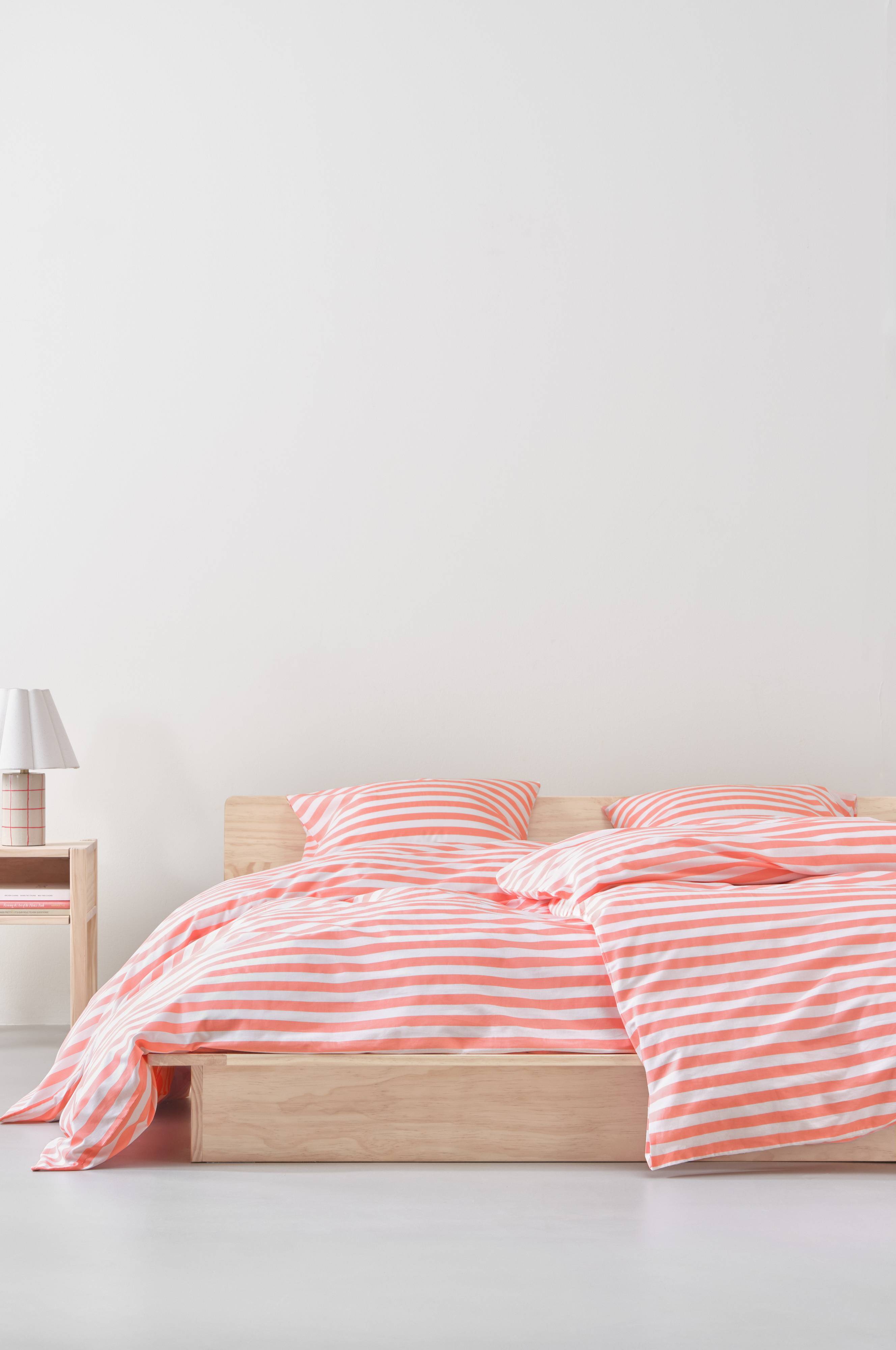Stribet sengesæt i to dele, et dynebetræk og et pudebetræk af bomuld. Den tværgående stribe er printet i friske, sommerlige farver og på begge sider af pudebetræk og dynebetræk. Bomuld er en blød og behagelig kvalitet som føles kølig mod huden. Åbning i de øverste hjørner på dynebetrækket, så det er nemt at trække dynebetrækket over dynen. Trådtæthed på 144 tc. (Trådtætheden angiver antal tråde, thread count, pr. kvadrattomme i et stof. Jo højere trådtæthed desto højere kvalitet. Dog undtaget hør, der ofte væves løsere for at få det rette udtryk).