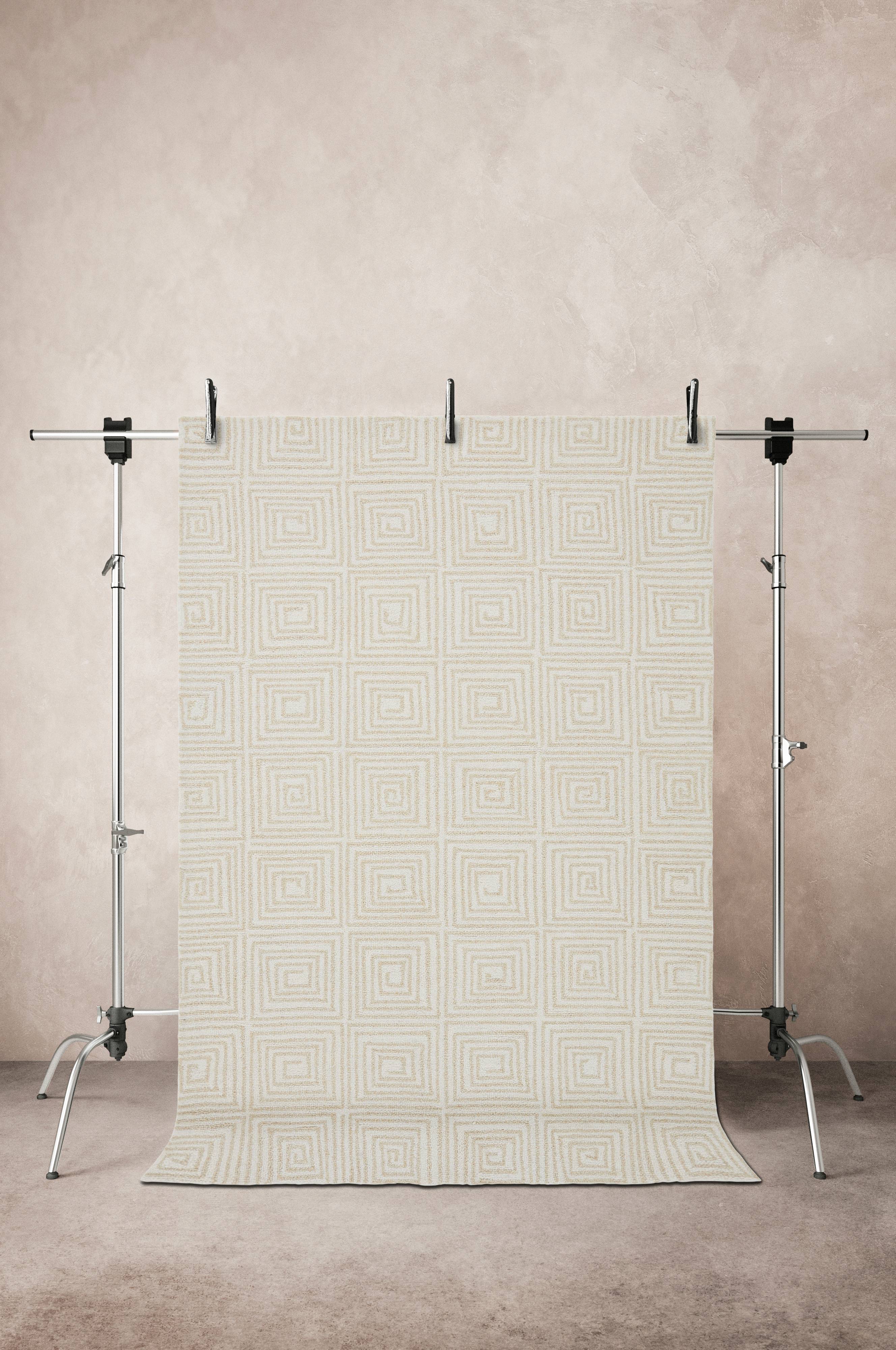 Håndknyttet tæppe med geometrisk mønster opbygget af smalle striber i kvadrater. De smalle striber er garnfarvede i beige toner og mønstret er diskret hvilket gør tæppe let at placere. Den lyse farve kan variere lidt i nuancen, eftersom ulden er ufarvet og har sin naturlige farve. En uldtæppe er altid varmt og skønt og desuden naturligt smudsafvisende. En håndlavet tæppe er et fint håndværk og hvert tæppe er unikt. Luvhøjde 0,8-1 cm. Tykkelse 1,6-2,5 cm. 3500-3700 g/m².