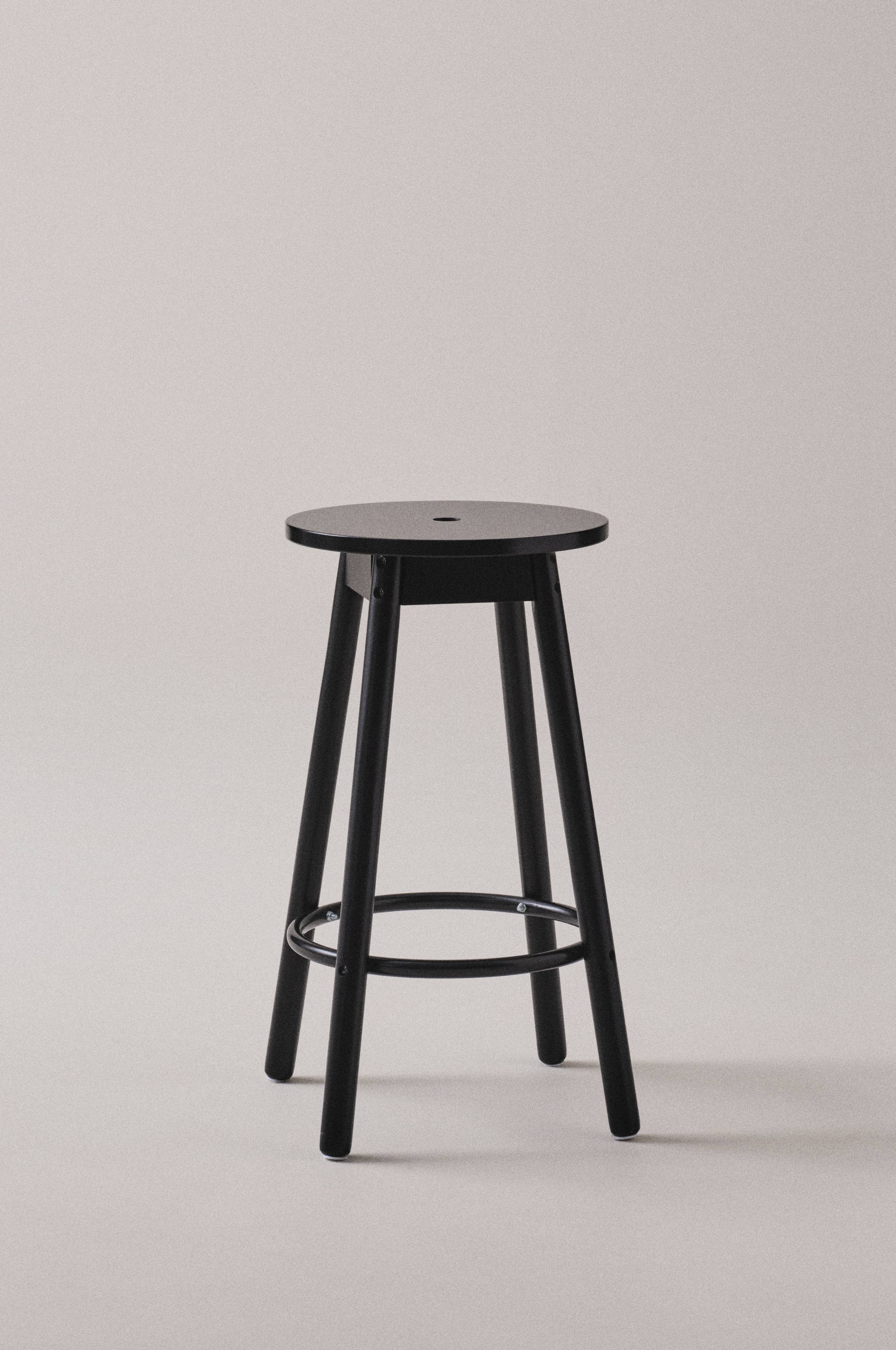 Rund, høj taburet med ben af massiv fyrretræ og sæde af MDF. Den fint malede taburet er i stilren, klassisk model med skandinavisk inspiration. Sædet har et dekorativt hul i midten. Fodstøtte af metal følger med, som du kan montere, hvis du ønsker det. Lidt montering kræves. Samlevejledning medfølger.