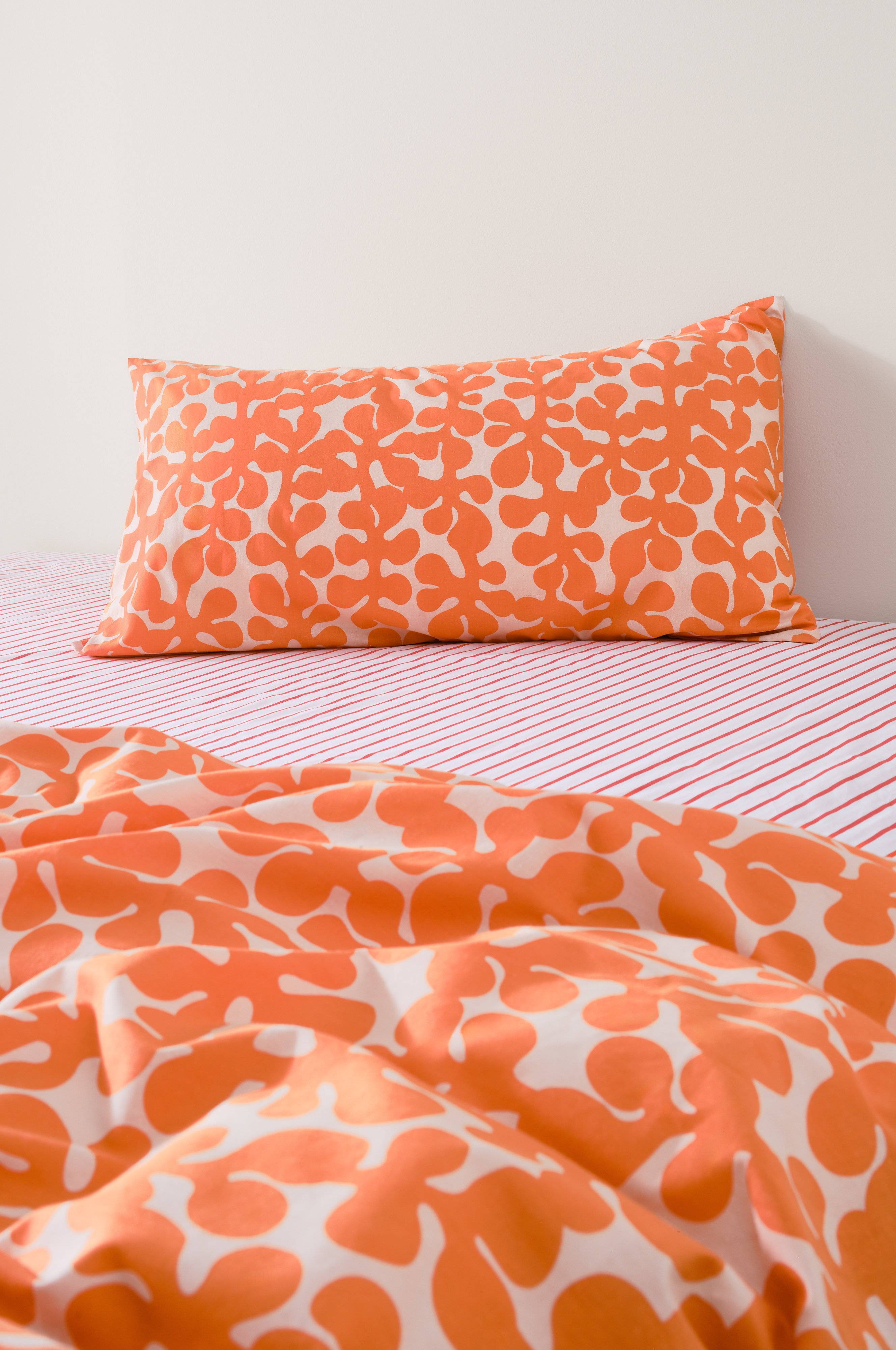 Pudebetræk designet af Maria Carlberg. Et levende, mønstret pudebetræk i økologisk bomuld med et retroinspireret mønster til et drømmende soveværelse.