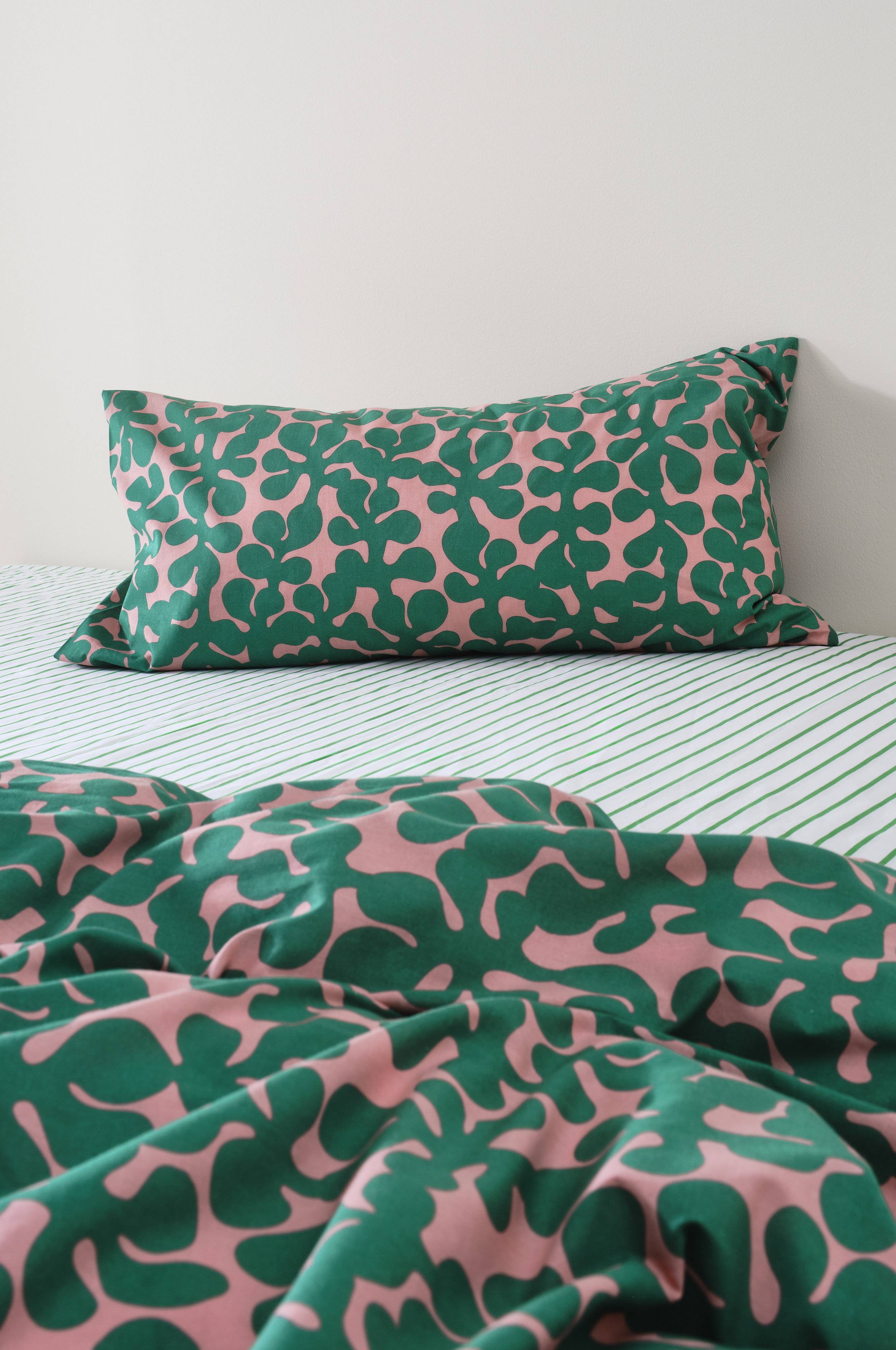 Pudebetræk designet af Maria Carlberg. Et levende, mønstret pudebetræk i økologisk bomuld med et retroinspireret mønster til et drømmende soveværelse.