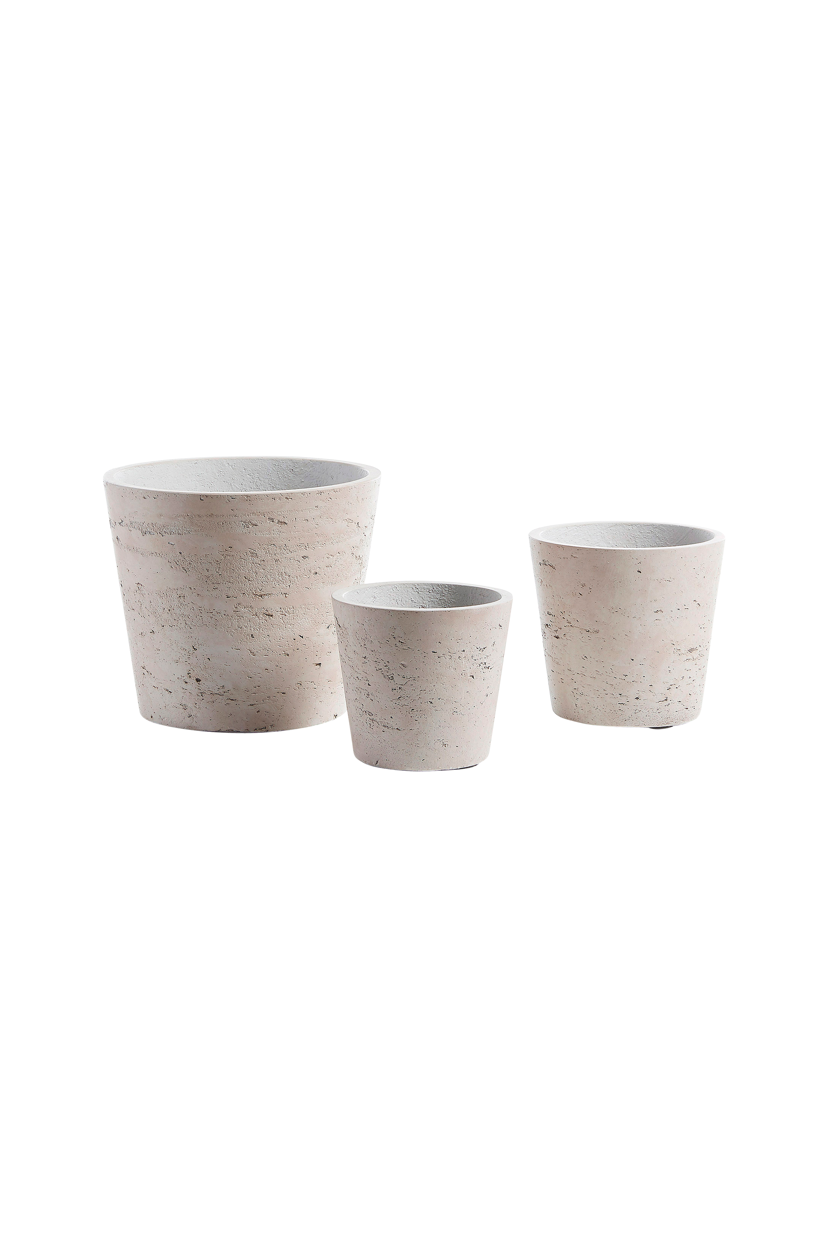 3 stk. krukker af cement i forskellige størrelser. Til brug indendørs og udendørs. Højde 20 / 15 / 13 cm. Diameter 23,5 / 16,5 / 14 cm.