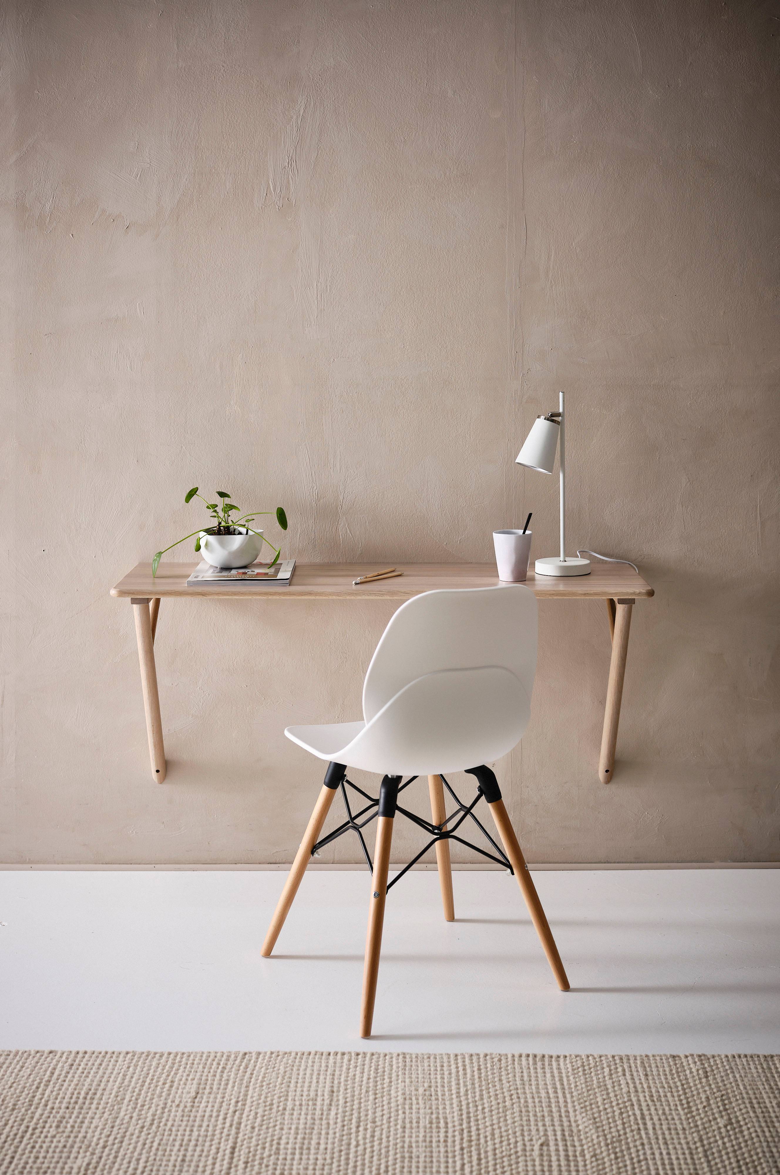 Vægmonteret skrivebord af sæbebehandlet eg. Praktisk model, som monteres på væggen i den ønskede højde. Bordet er stilrent og enkelt og passer ind alle steder. Forborede huller gør det nemt at skrue skrivebordet fast på væggen.