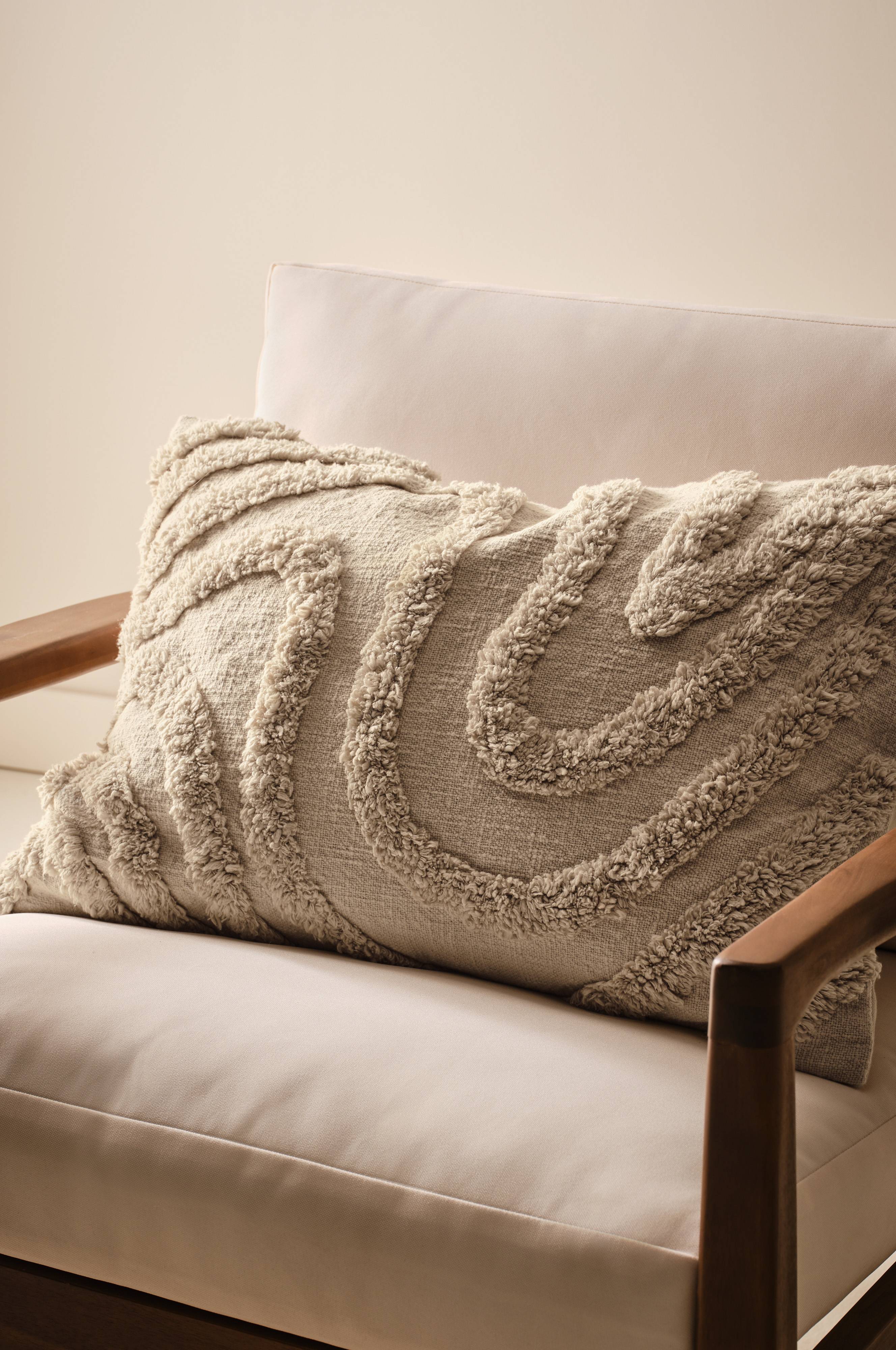 1-pak pudebetræk med bølgemønster, der er tuftet, så mønsteret er dannet af kort luv på et lidt grovere stof med slubeffekt. Forsiden er foret. Pudebetrækket har vævet, offwhite bagside med skjult lynlås.