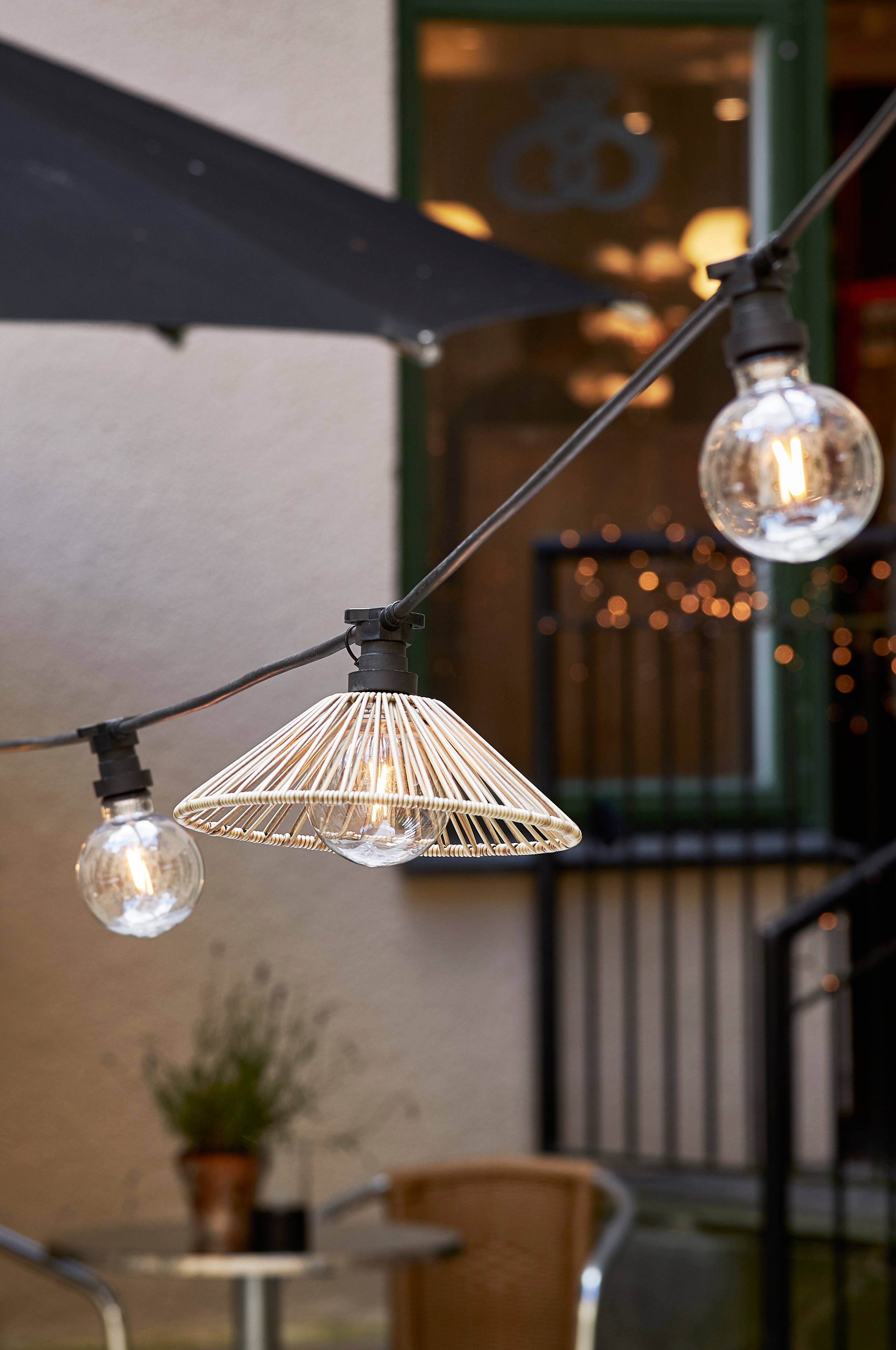 Lampeskærm i kunstrotting til udendørs brug. Mix og match med vores lyskilder og ledningsophæng til udendørs brug. Passer til ledningsophæng med en E27 sokkel. Højde 8 cm og diameter 25 cm.