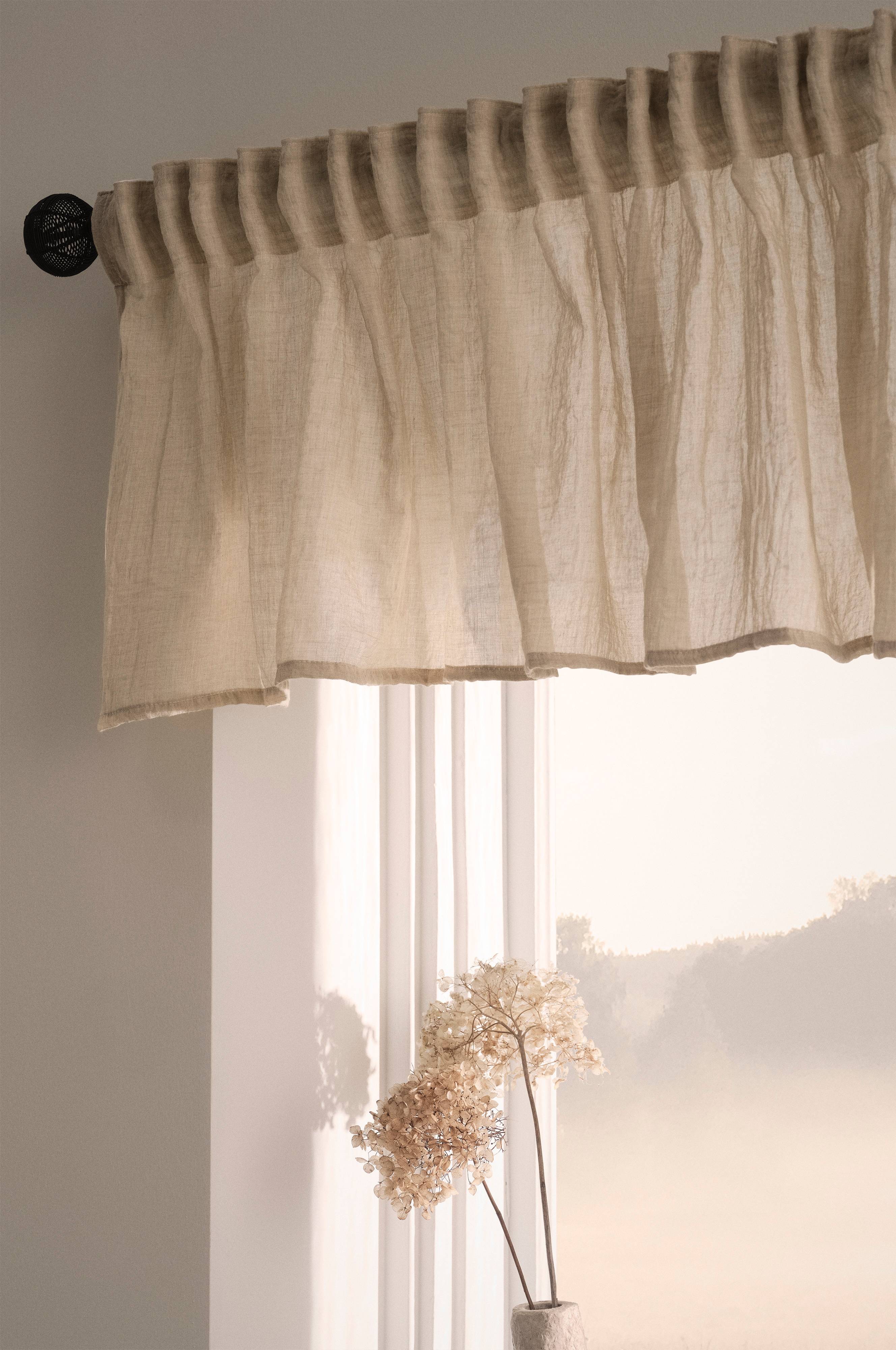 Gardinkappe i let og luftig kvalitet af polyester/bomuld som falder let. Kappen har påsyet multifunktionsbånd foroven og kan hænges op med fingerkroge, løbegang samt skjulte stropper.