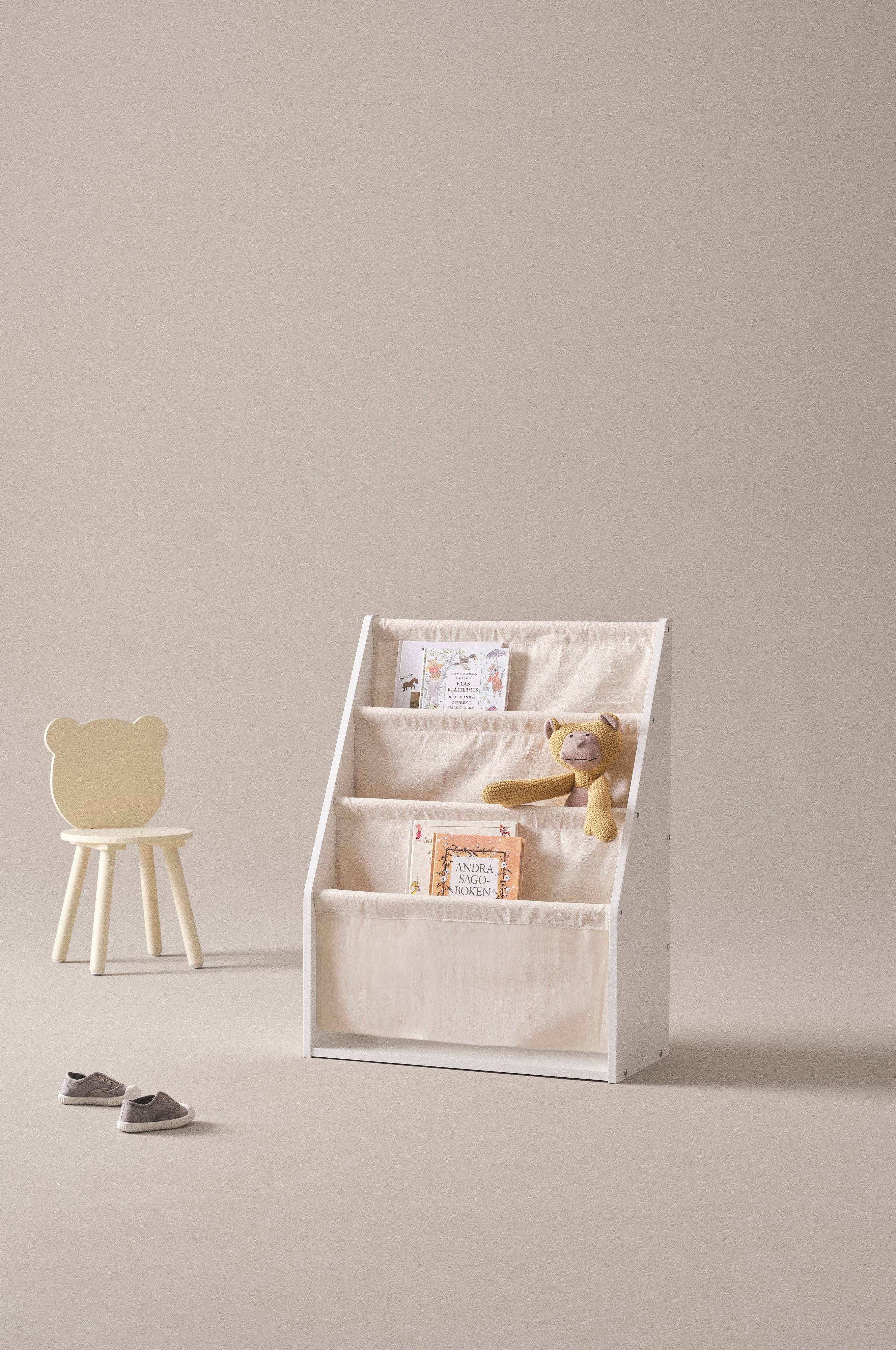 Børnehylde i MDF med runde stænger af fyrretræ og tre stofhylder af bomuldslærred. Børnehylden er stabil og har en træhylde i bunden, stoffet i rummene er et lidt kraftigere naturfarvet kanvas. Stofhylderne bliver som en taske eller et rum og det er rart at lægge bøger i med fronten mod barnet, så det bliver nemt at vælge. Hylden er også hyggelig at stille alle dine tøjdyr i. I entreen bliver hylden et perfekt sted til huer og handsker, som barnet selv kan nå. Skal færdigsamles. Samlevejledning medfølger.