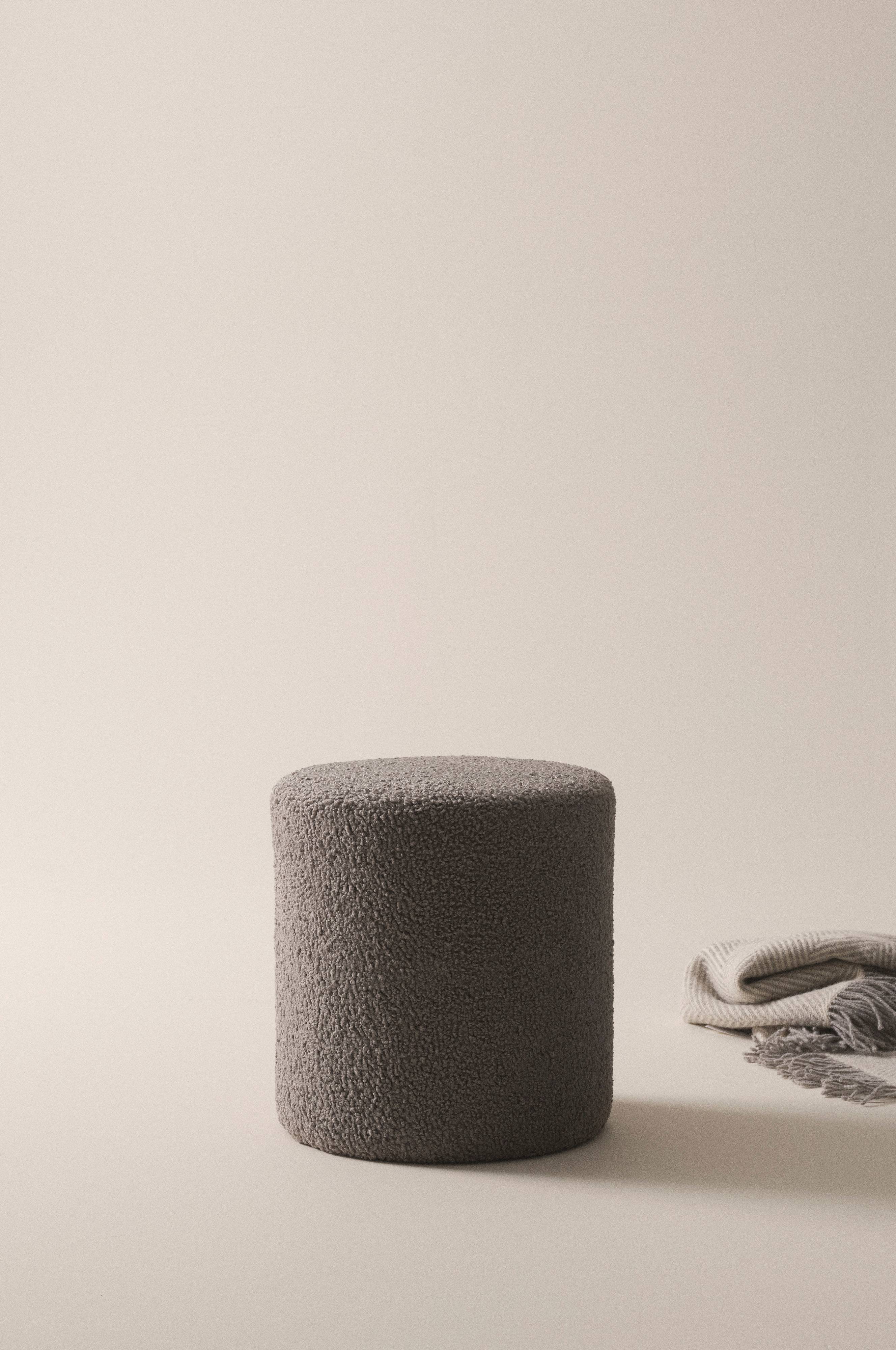 Rund siddepuf med fast fåreskindslignende plysbetræk af polyester. Puffen har træramme af fyrretræ og plywood kombineret med koldskum som gør den blød. Den skønne siddepuf kan bruges som fodskammel eller til at sidde på. Det robuste plysstof har en slidstyrke på 100.000 Martindale.
