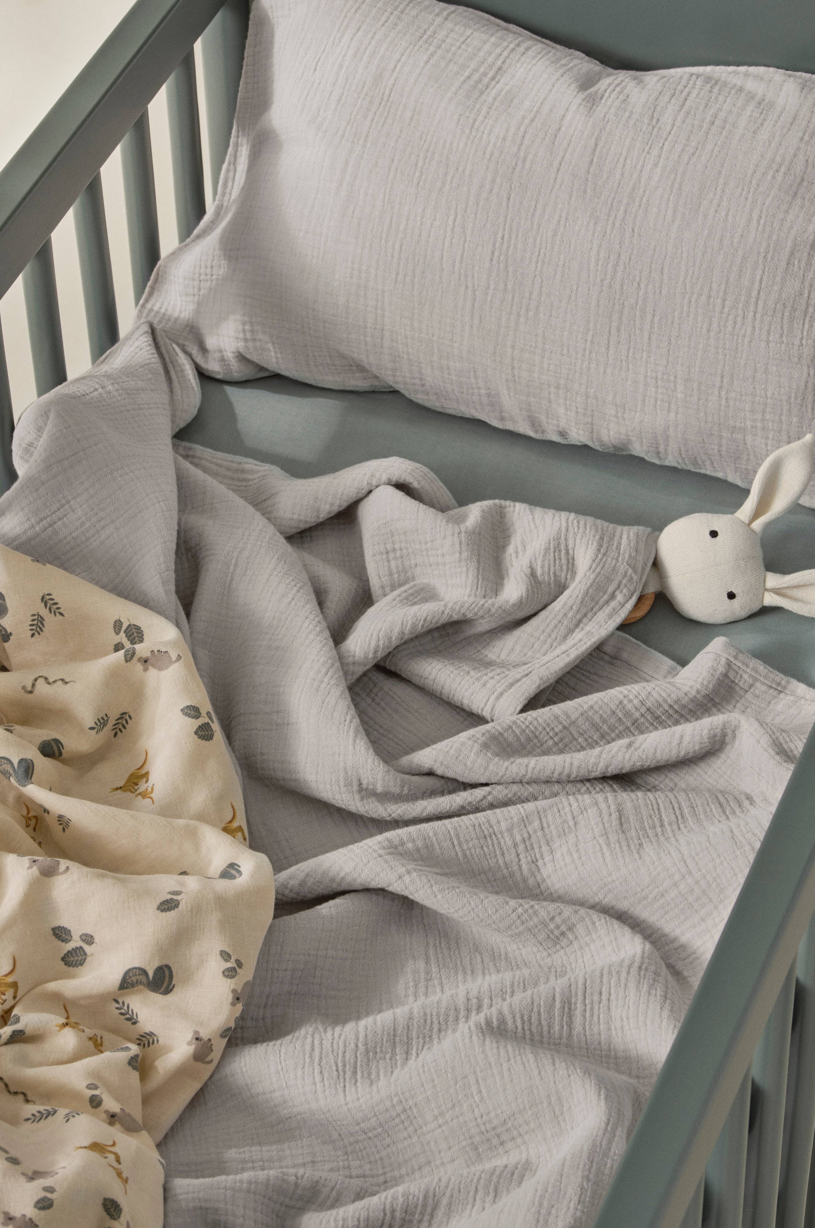 Sengesæt i 2 dele i skøn, økologisk bomuldsmusselin. Sættet passer til tremmeseng. Musselin er et blødt stof, vævet med boblende effekt, hvilket gør stoffet blødt og ekstra praktisk. Du behøver ikke at stryge eller rulle. Det behagelige musselin er skønt at sove i. Åbning i de øverste hjørner på dynebetrækket, så det er nemt at trække dynebetrækket over dynen. Trådtæthed på 178 tc. (Trådtætheden angiver antal tråde, Thread Count, pr. kvadrattomme i et stof. Jo højere trådtæthed desto højere kvalitet.)