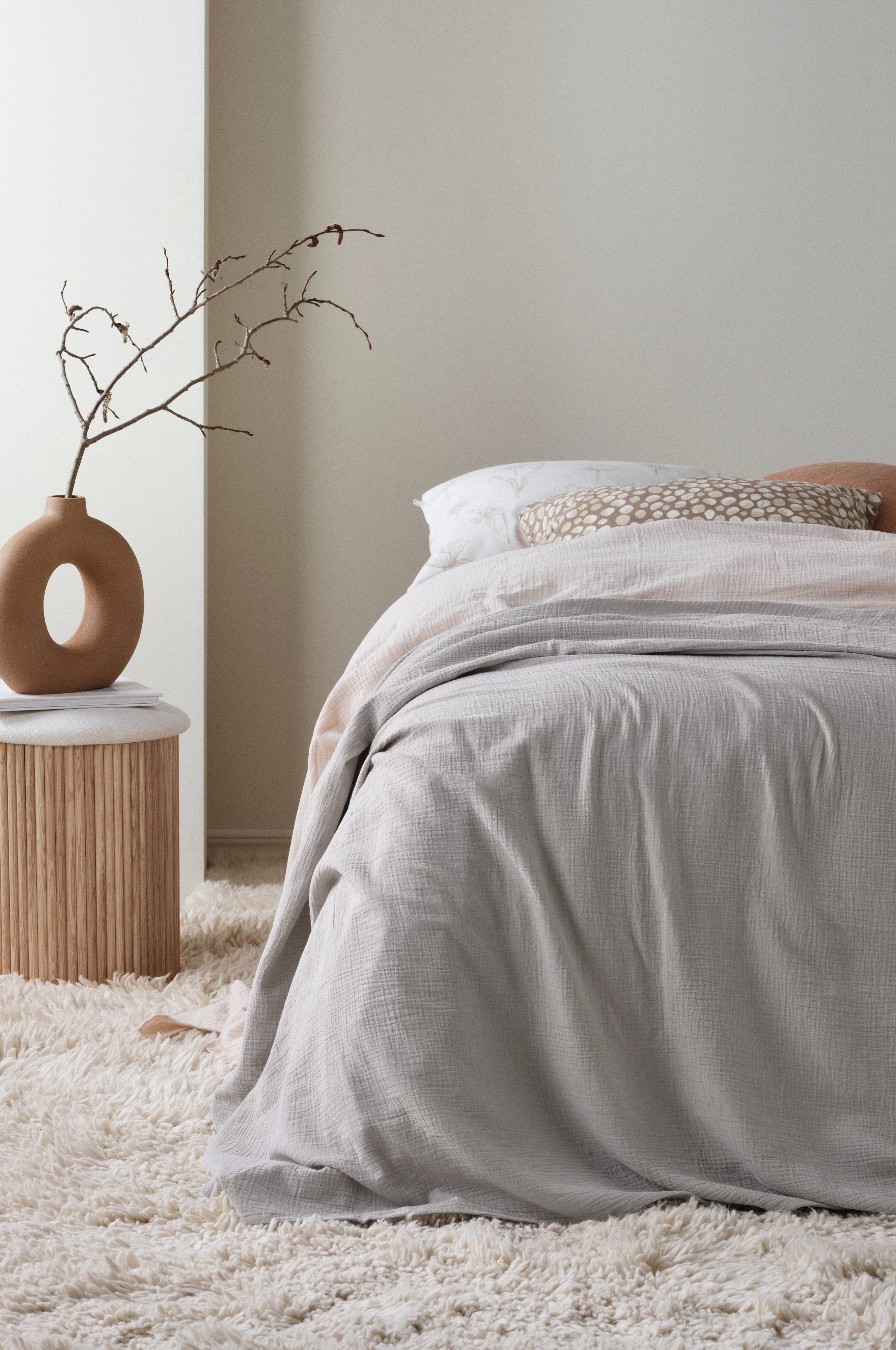 Ensfarvet sengetæppe til enkeltseng. LILIA er i skøn, økologisk bomuldsmusselin. Musselin er et blødt stof, vævet med boblende effekt, hvilket gør stoffet blødt og ekstra praktisk. Du behøver ikke at stryge eller rulle. Pudebetræk medfølger ikke, købes separat.