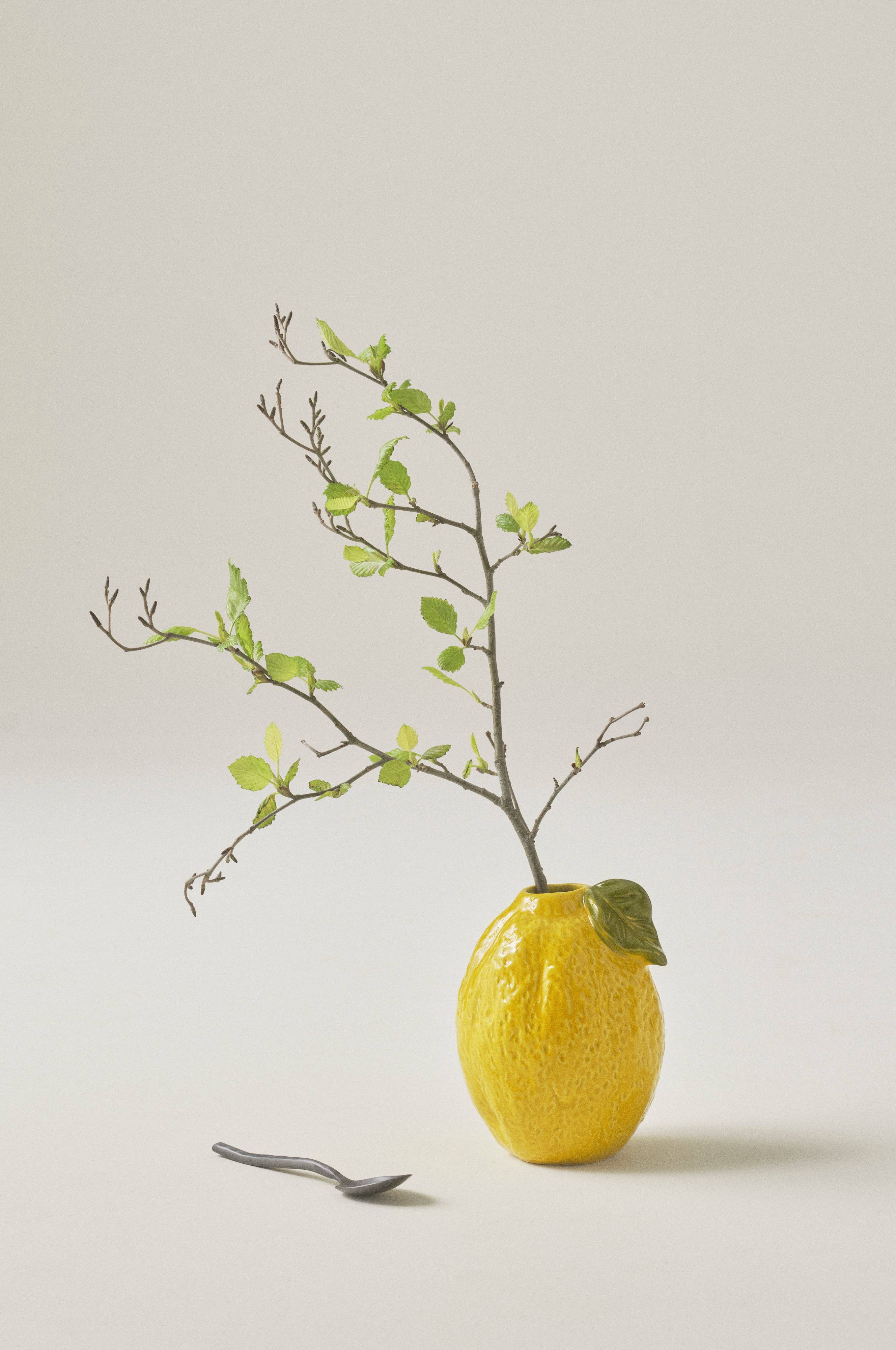 LIMONE er en håndlavet, farvestrålende vase inspireret af citrusfrugter og dekoreret med grønt blad. Vasen har fin struktur og den er glaseret i gult med grønne detaljer, selv indersiden er glaseret. Det fine håndværk gør hver vase unik. Husk, at fugt kan trænge igennem keramik.