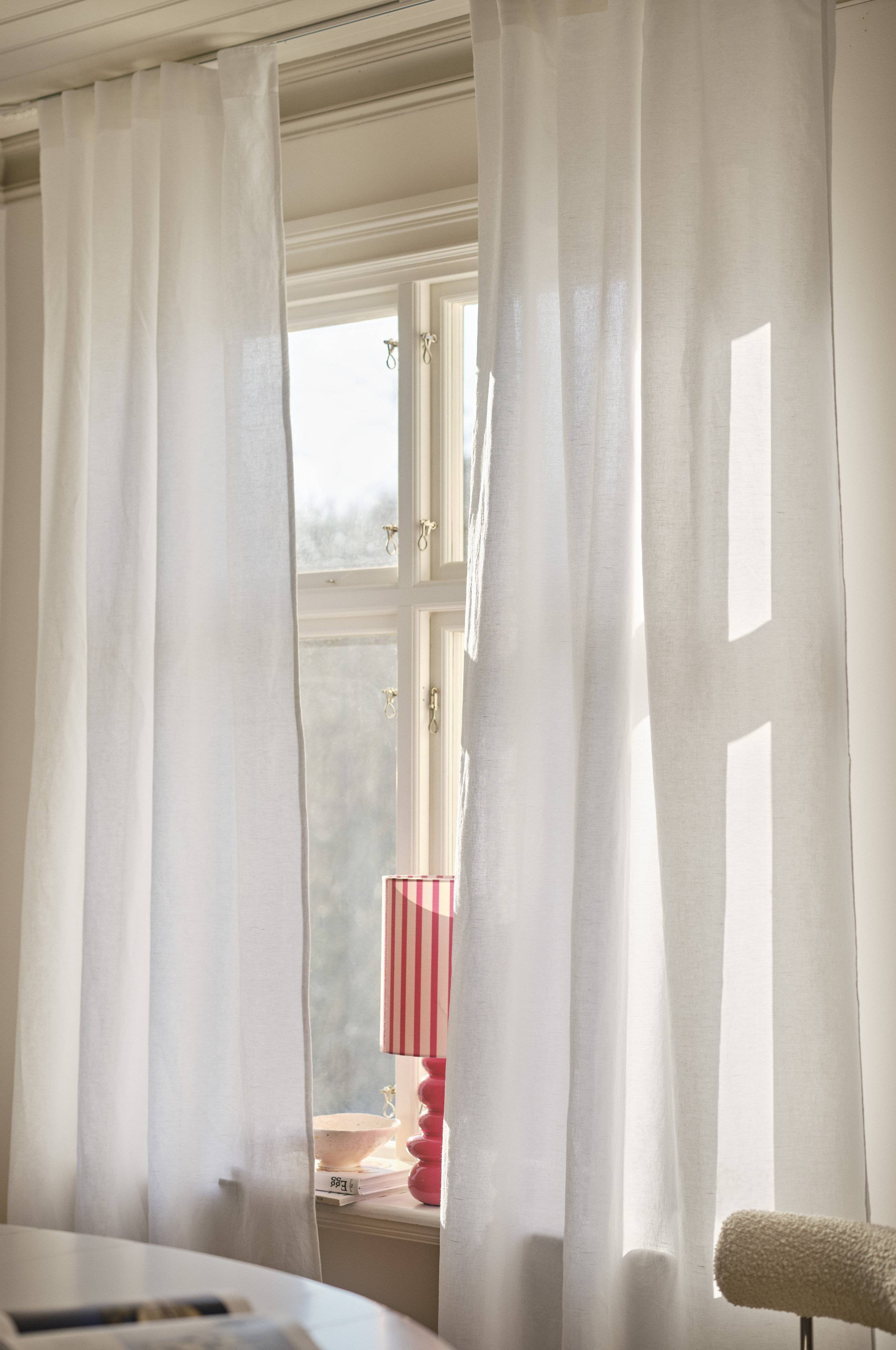 Gardinens længde kan variere en smule ved levering, da naturmaterialer som hør påvirkes mere af temperaturen end syntetiske materialer. En variation på 1-2 cm fra de angivne mål er helt naturlig.