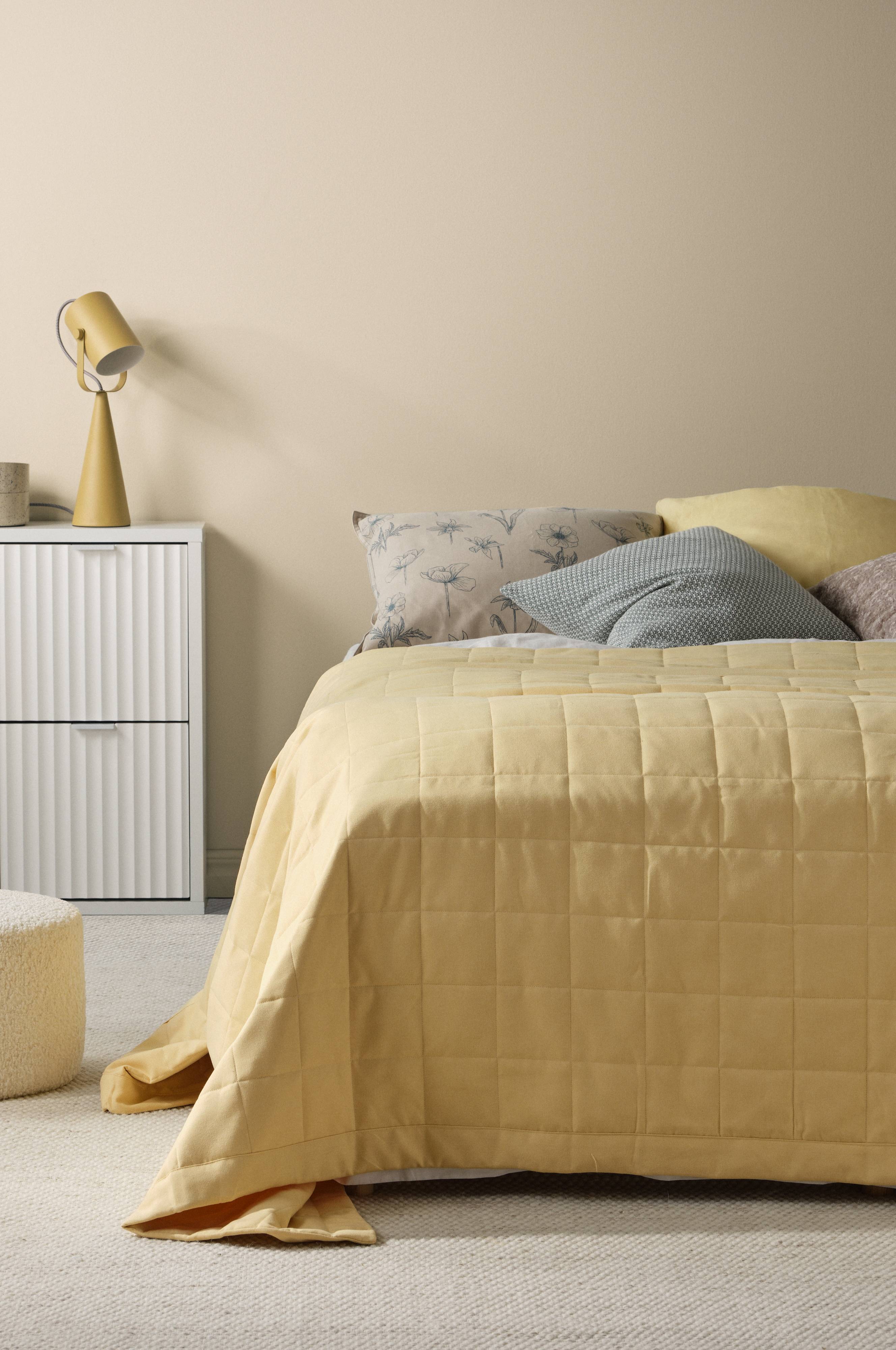 Ensfarvet sengetæppe til dobbeltseng i blød polyester med fin struktur som giver et skønt hørlook. LINDEN sengetæppe er quiltet i dekorative firkanter. Fyld af polyester 80 g/m².