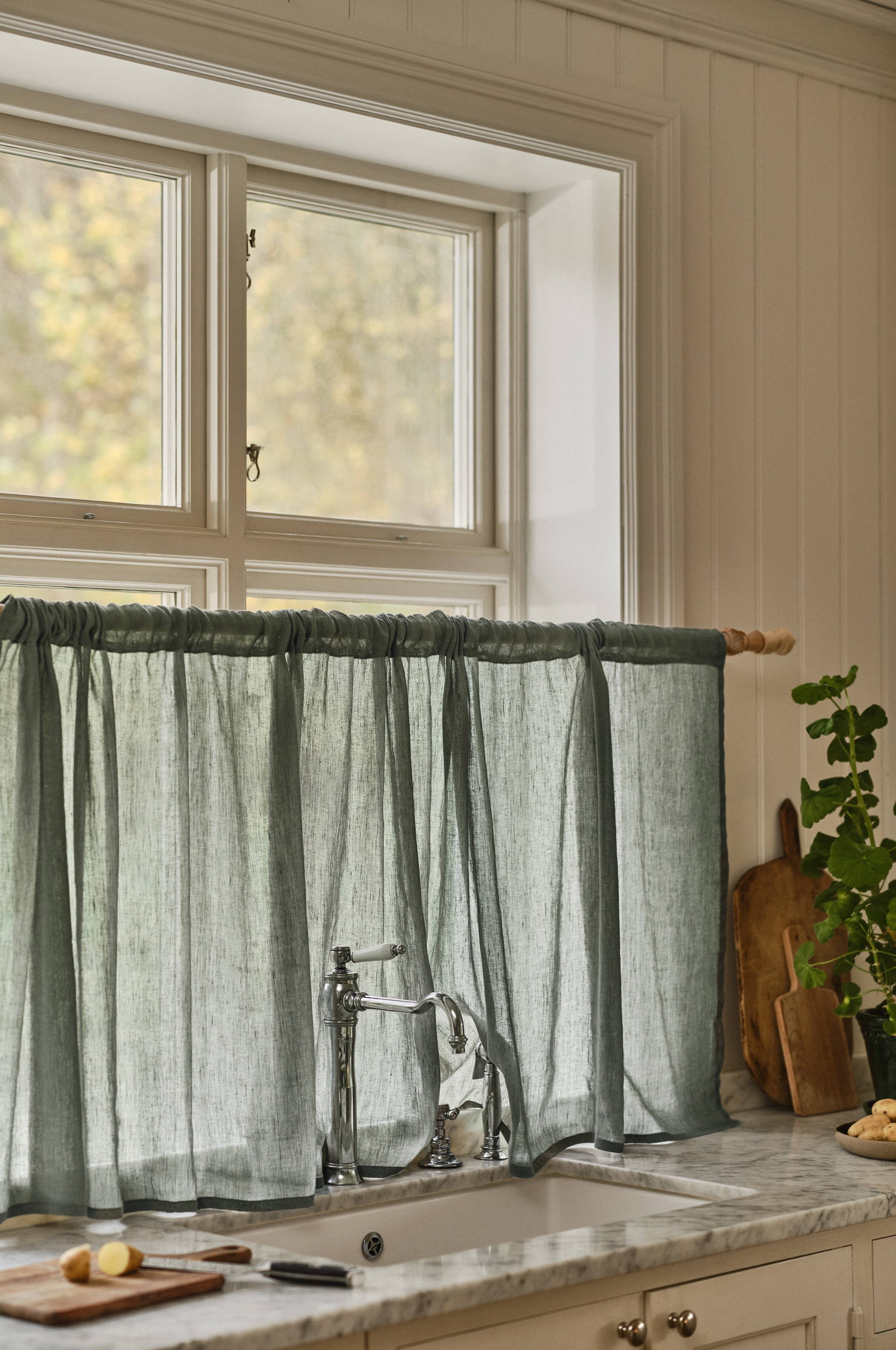 Cafégardinet LINN er meget charmerende i et køkkenvindue. Dette gardin er fremstillet af en blanding af bomuld og hør i almindelig vævning og giver fint privatliv, samtidig med at det lader naturligt lys komme ind i dit rum. Fås i en række smukke farver.