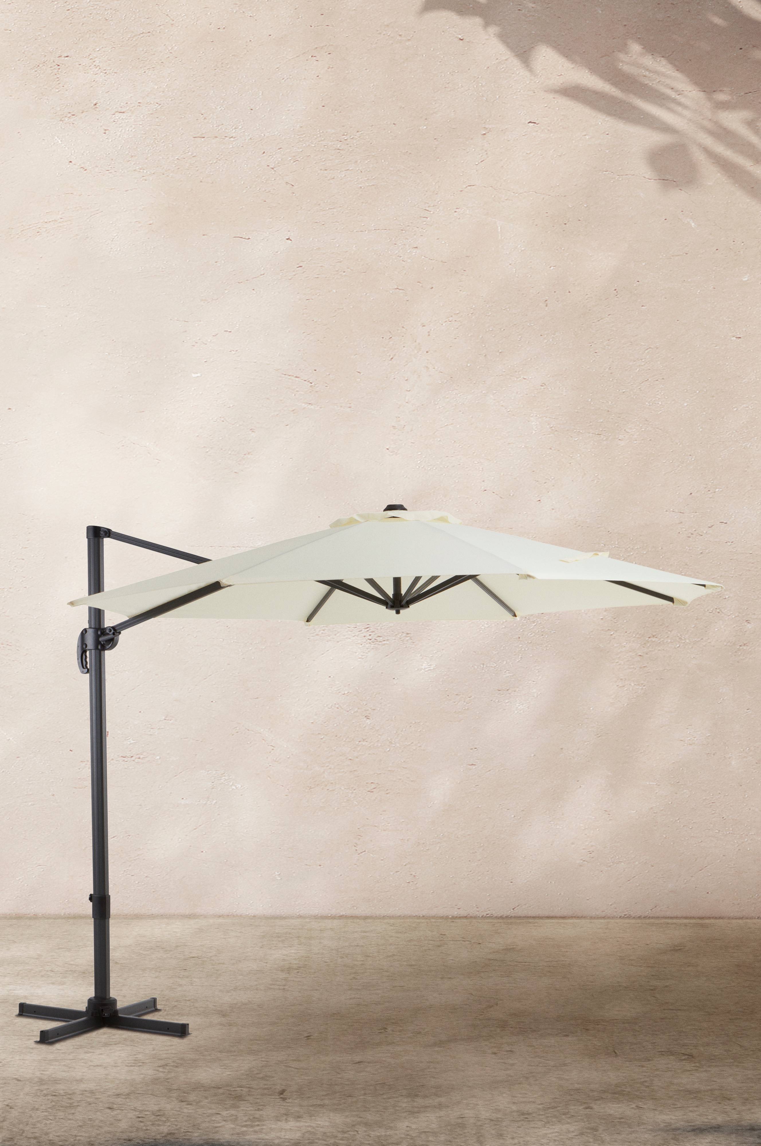 Stor parasol, der har en foldearm, så den kan stå ved siden af havemøblerne. Parasollen skrues op med en fleksibel krankmekanisme. Armen går ud til siden og hænger over møblet og giver behagelig solbeskyttelse. Praktisk løsning, hvis du ønsker skygge over hele bordet og ikke har hul til parasol i bordet.