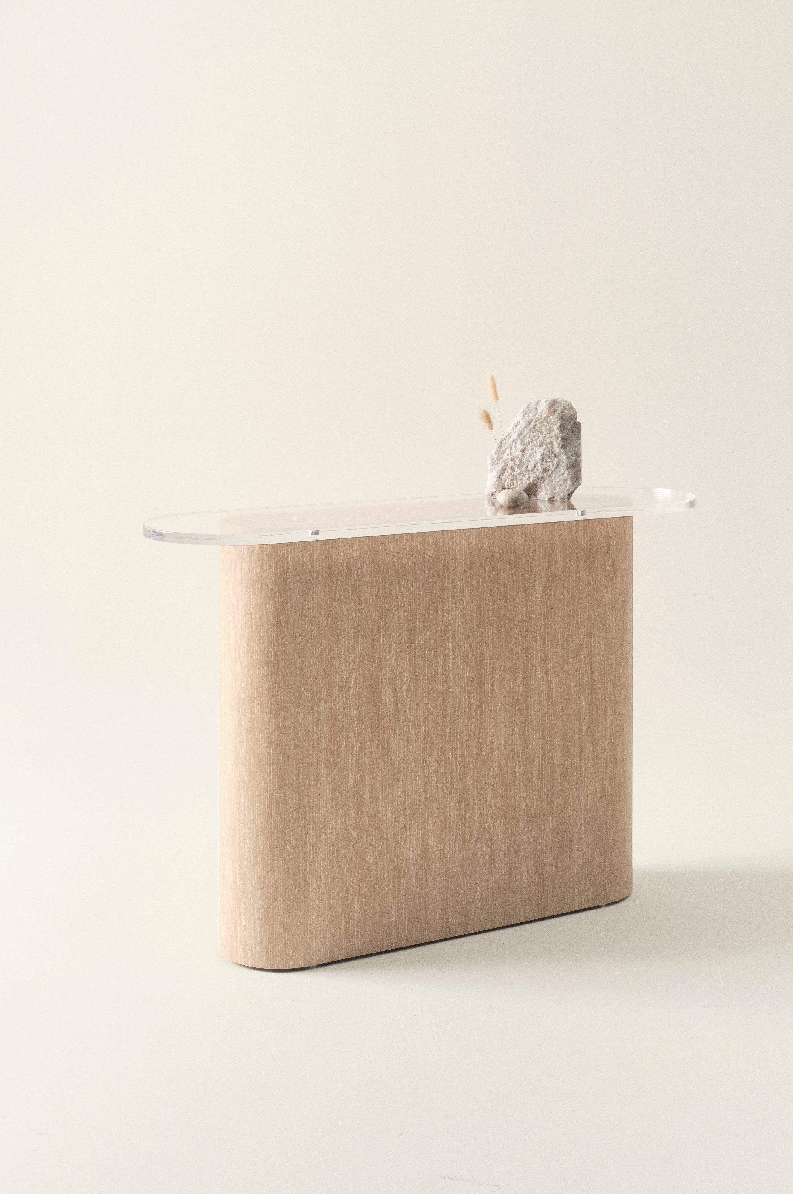 Skænk af MDF med bordplade af akrylglas. Den nederste del er blødt oval og er beklædt med finér. Bordpladen er også oval og af akrylglas. LIVI har enkel og ren form med blød fremtoning og retrostil. Det er en skænk med fleksibel anvendelse og passer fint i dagligstuen, eller hvorfor ikke i entreen eller soveværelset? Skal færdigsamles. Samlevejledning medfølger.