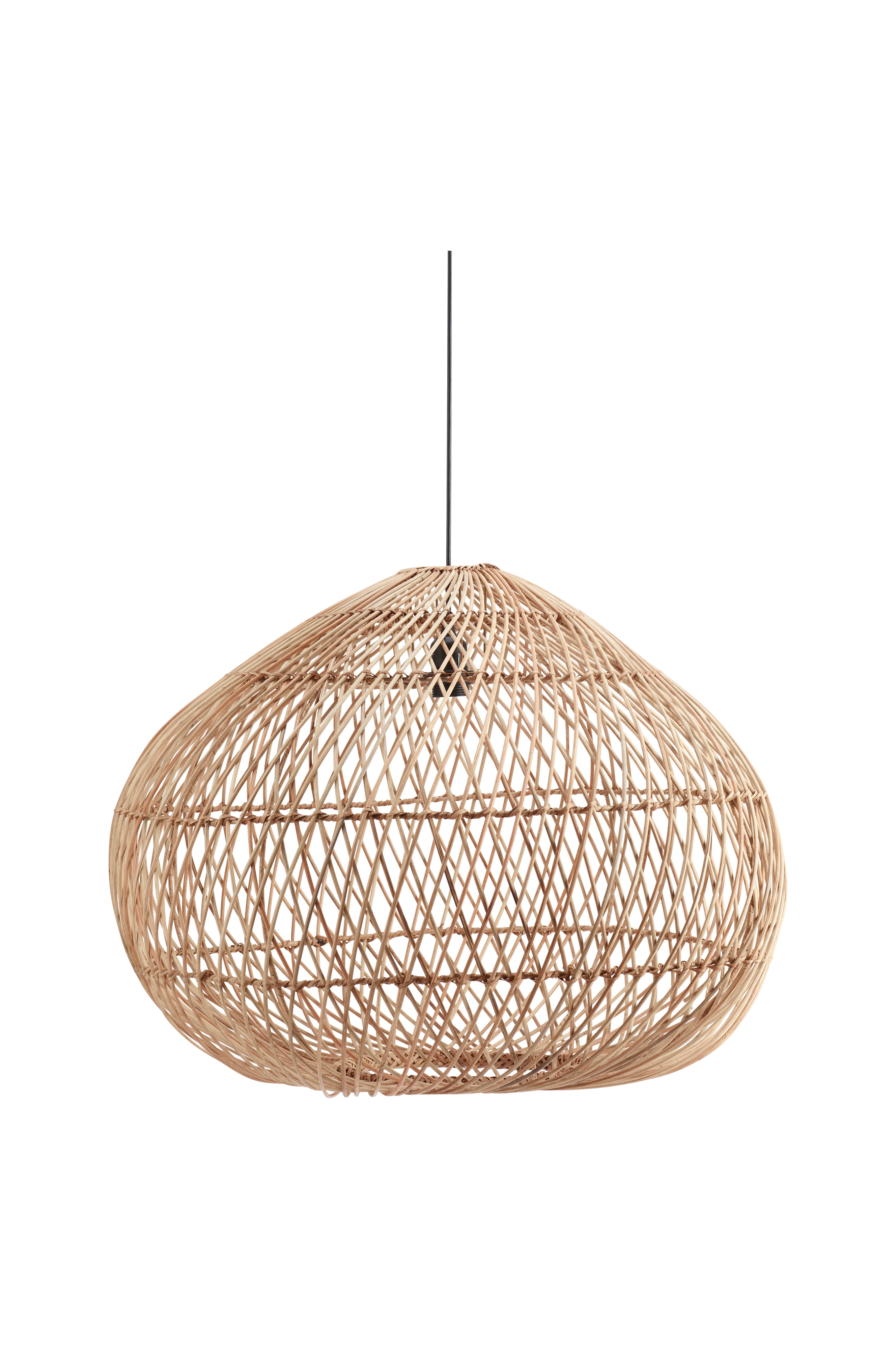 Loftlampe Karen i flettet rotting. Naturmaterialet kan skifte i farven. Hver enkelt skærm er håndlavet og der kan forekomme mindre afvigelser i størrelse. Leveres med sort ledning og E27-fatning i plast, 1,2 meter med baldakin til indendørs brug. Loftkontakt købes separat. Højde 53 cm, bredde 70 cm og dybde 70 cm. Ujordet.