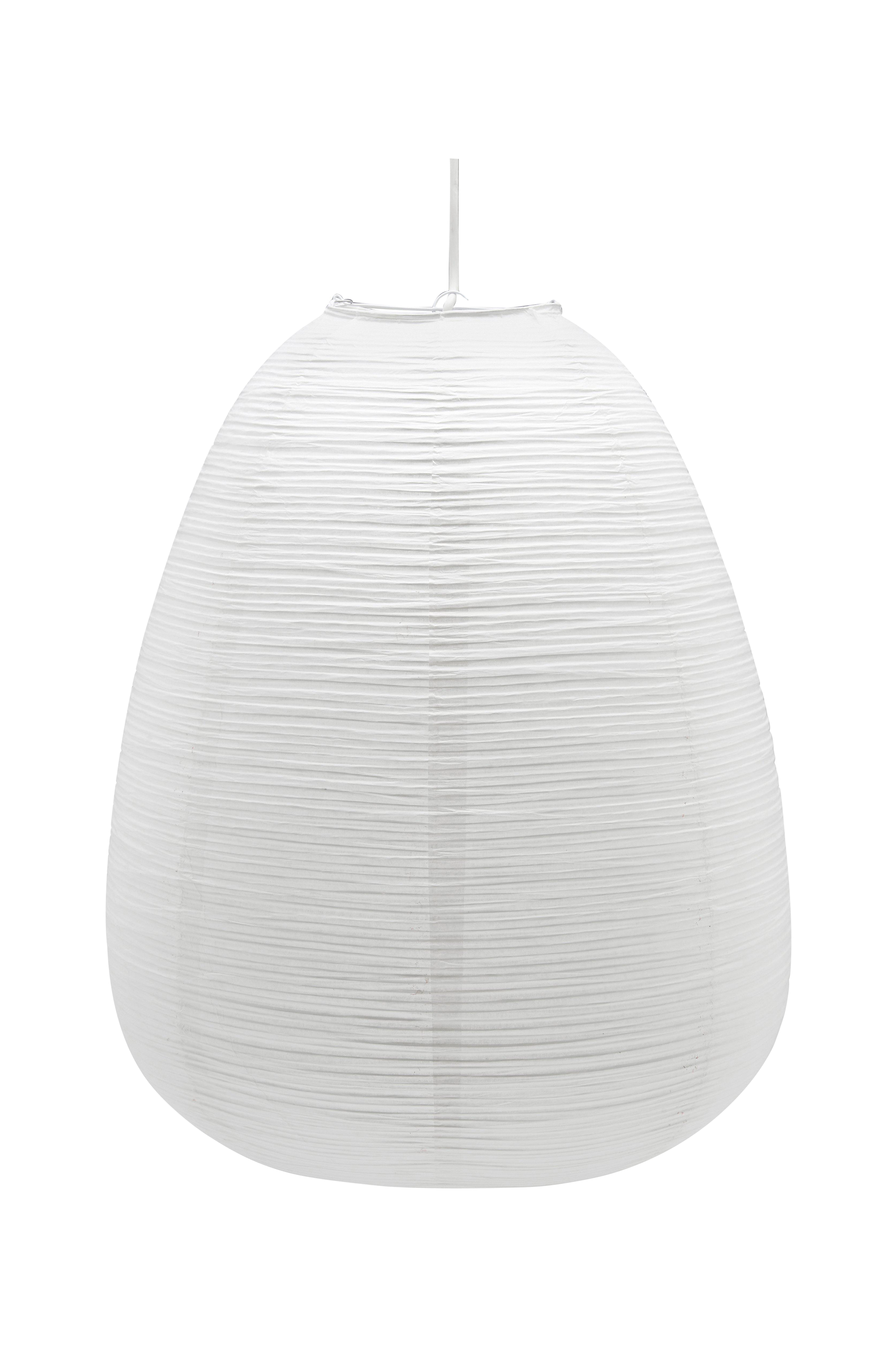 Rispapirskærm Maki med tæt uregelmæssig metaltråd som skaber et smukt mønster. Maki er æggeformet, 43 cm i diameter og 54 cm høj. Leveres uden ledning. Spændes ud til sin form ved hjælp af en metaludvider, som man også fastgør ledningen i.