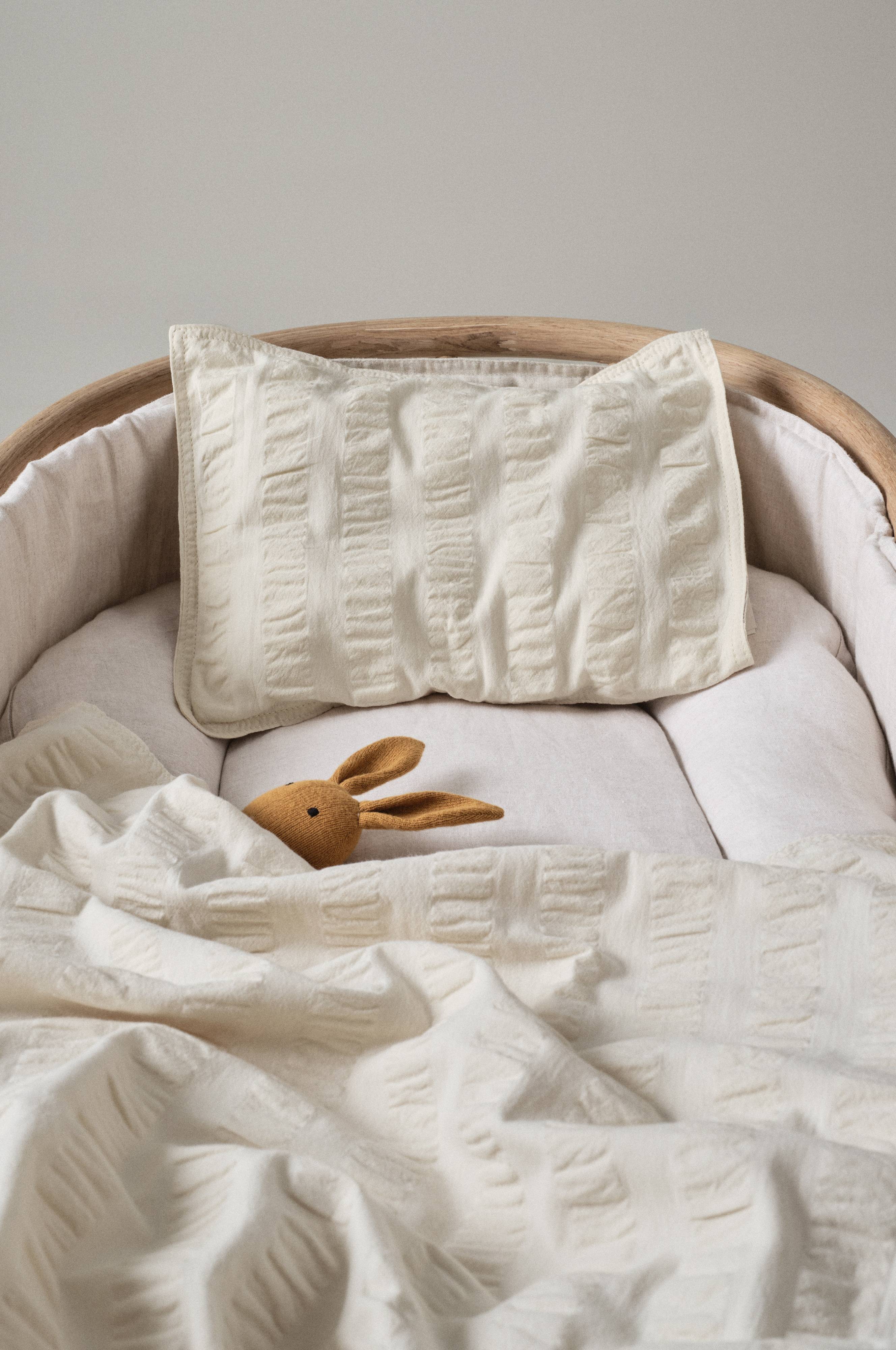 1-pak pudebetræk i skøn bæk og bølge af certificeret, økologisk bomuld. Bæk og bølge er en luftig kvalitet og stoffets boblestruktur føles svalt og behageligt. Serien LOLO er ensfarvet og samtidigt stribet, glat stof blandet med striber i bæk og bølge. Stoffet er garnfarvet og vasket for at få et blødere udtryk. Det lille pudebetræk passer godt i barnevognen og vuggen. Trådtæthed på 120 tc. (Trådtætheden angiver antal tråde, Thread Count, pr. kvadrattomme i et stof. Jo højere trådtæthed desto højere kvalitet.)